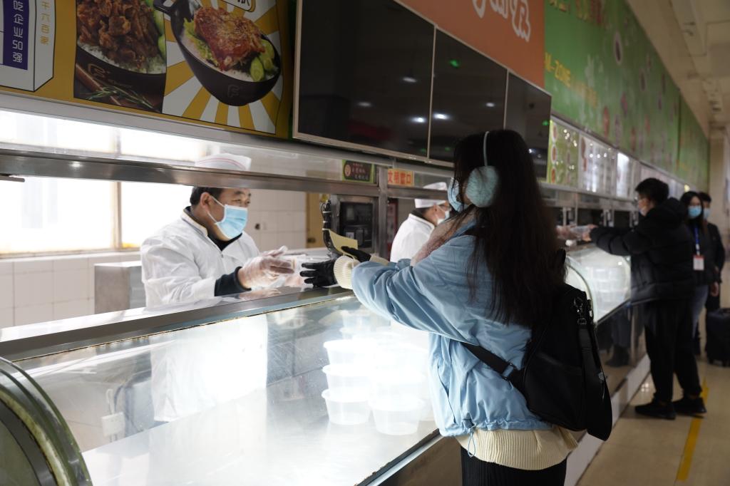 在学生餐厅一楼南入口,醒目的疫情防控宣传展板、就餐流程图、温馨提示牌引导学生有序购餐、用餐。学生在食堂外进行餐前洗手,经红外体温检测后,体温正常者进入食堂。根据工作人员及引导标识指引,保持安全距离排队取餐,单人单桌同向入座就餐。