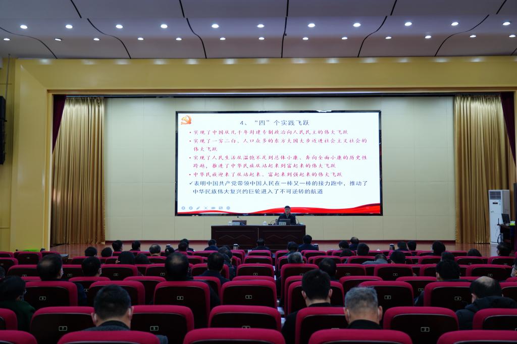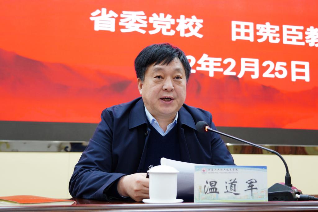 2月25日,学校在孔明路校区大学术报告厅召开党委理论学习中心组(扩大)集体学习,并邀请到省委党校田宪臣教授作党的十九届六中全会精神辅导报告。全体党委理论学习中心组成员及中层干部参加学习。报告会由党委书记温道军主持。