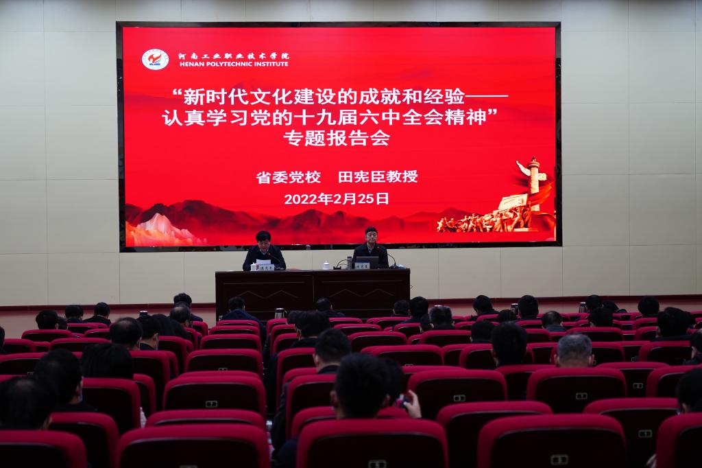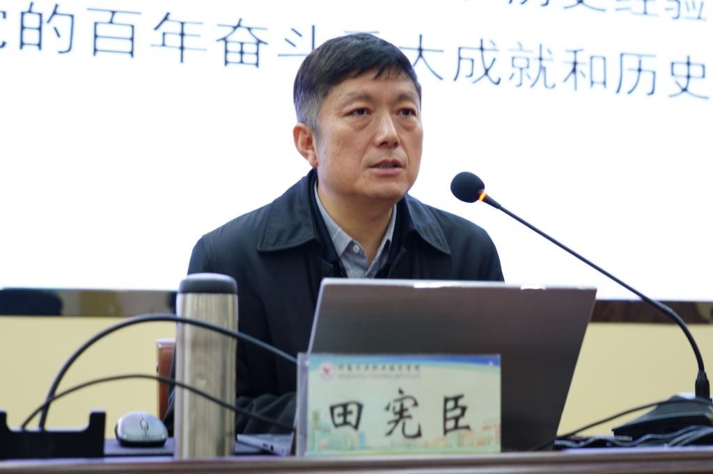 田宪臣以《新时代文化建设的成就与经验——认真学习党的十九届六中全会精神》为题,围绕《决议》的主要内容、新时代文化建设的伟大成就和基本经验三个方面,结合自身的学习领悟,深入浅出地阐释了《决议》出台的背景意义和内容,全面系统地解读了十八大以来新时代文化建设的三个方面伟大成就及“五个必须”的基本经验。田教授的报告高屋建瓴、内涵丰富,是一堂生动的理论教育课,对于全校深入学习领会党的十九届六中全会精神和做好新时代文化建设具有很强的针对性、指导性。