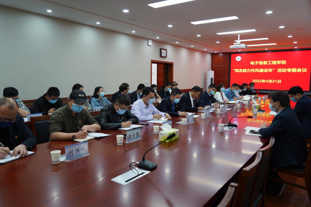 4月21日下午,电子信息工程学院在学院会议室召开“观念能力作风建设年”活动专题会议,党委书记温道军参加会议并指导工作,党政办公室主任马小兵对专题会议进行督导,电子信息工程学院全体党政领导、全体副科级干部参加会议,会议由学院党总支书记朱昭主持。