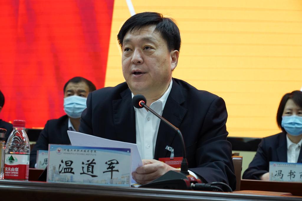 温道军发表重要讲话。温书记指出,本次会议讨论了校长王伟所作的行政工作报告、工会主席屈保中所作的工会工作报告等五个报告,选举产生了第三届工会委员会、工会经费审查委员会委员,通过了第三届工会女工委员会及教代会六个专门委员会成员名单,与会代表认真履行代表的神圣职责,充分使用民主权利,紧紧围绕推进学校高质量发展主题和师生员工共同关心的问题,进行了认真热烈的讨论,提出了许多建设性的意见和建议。大会展现了团结、务实、民主、和谐的新形象,形成了教职工参政议政、民主管理的浓厚氛围,达到了总结工作,发扬民主,明确任务、加油鼓劲的目的,是一次坚持党的领导、充分发扬民主的大会,工会要认真将代表们的宝贵意见和提议进行梳理,建立工作台账,开展明确责任单位和部门,尽快解决,并及时将落实情况向代表们进行反馈,不辜负各位代表和广大教职工的殷切希望和充分信任。就贯彻落实好会议精神,做好2022年各项工作,温书记提出四点希望。一是提高站位,凝聚共识,在坚持党的领导中找准努力方向。五年来,学校工作卓有成效,事业发展硕果累累,一切成绩的取得,根本在于党的坚强领导,在于我们不忘初心,始终遵循习近平新时代中国特色社会主义思想的科学指引。我们必须捍卫“两个确立”,增强“四个意识”,坚定“四个自信”,做到“两个维护”,始终坚持为党育人、为国育才的初心使命,奋勇前进。要站稳政治立场,把坚持党的全面领导作为最根本的政治原则,始终胸怀两个大局,不断提高政治判断力、政治领悟力、政治执行力。要夯实思想根基,进一步加强理论武装,用习近平新时代中国特色社会主义思想凝心铸魂。要确保同频共振,把讲政治体现在实际工作中、具体实践中和一言一行中,以实际行动做到党委有号召,代表有响应。二是汇集力量,开拓进取,在围绕中心服务大局中履职尽责。各位代表要发挥好排头兵、先锋队的作用,争当育人先锋、教学先进、科研尖兵、服务表率,凡事以学校大局为重,以学校整体利益为重,带动广大师生齐心协力推动学校发展。广大代表要围绕学校重点工作,找准履职的切入点、结合点、着力点,多建睿智之言,多献务实之策,多谋发展之道,多宣传党委行政的重大决策和工作部署,多做统一思想、凝聚人心、鼓舞士气的工作,引导和激励全校师生员工团结一致,振奋精神,把广大师生的共识凝聚起来、智慧聚集起来、力量汇集起来,共同推动学校高质量跨越发展。三是凝聚人心,增进团结,在不懈奋斗中贡献智慧力量。要擦亮团结底色,全校上下要坚定一条心、拧成一股绳、上下一盘棋,人人为发展尽力、个个为责任担当。要鼓起拼搏的制胜法宝,我们每位教职工都承载着学校发展的光荣和梦想,都要立足岗位,脚踏实地,为梦想不舍昼夜,用拼搏奋斗定义时光,要吹响奋斗前行的号角,继续拉高标杆,只争朝夕,勇于前行。各位代表要做学校发展的奋斗者,主动担负起硬脊梁,磨炼干事的铁肩膀,练就践行的铁脚板,增强履职的真本领,立足教书育人岗位,继续发扬严谨治学、敢为人先的精神,坚持特色,争创一流,培养出更多听党话、跟党走、有理想、有本领、具有为国奉献的钢筋铁骨的高素质人才,在不懈奋斗中争创更大业绩,争取更大殊荣,争做更大贡献。四要聚精会神,善作善成,在加强自身建设中全面提升过硬本领。各位代表要切实提高自身履职能力,充分展现一线担当、一线作为,努力做到强担当、提素质、树形象。要强化理论学习,提高理论素质,全面提升政治把握能力、调查研究能力、联系群众能力、合作共事能力。要坚持守正创新,认真研究履职实践中遇到的新情况、新问题,以与时俱进的创新思维,不断完善“双代会”的制度体系,让履职更有方法、质效更有保障,为发挥代表主体作用提供更加坚实的保障,不断探索符合时代要求、符合学校实际、符合“双代会”特点的工作新形势、新方法、新举措。全体代表要坚守正道、修身慎行、怀德自重,把学校事业放在心上、把工作责任扛在肩上,争当参政议政的先进、民主监督的中坚、联系群众的桥梁、遵纪守法的模范,要知责于心、担责于身、问责于行,始终保持赶考的清醒和坚定,始终保持奋斗者的姿态和干劲,永不停步,永不懈怠,敢于担当,以守纪律、讲规矩、重品行的作风知识,在新时代的赶考路上交出高分答卷。全校师生要紧密团结在以习近平同志为核心的党中央周围,共同并肩奋斗,坚定前行,勇攀高峰,推进学校高质量跨越发展,以更加优异的成绩迎接党的二十大胜利召开,为实现第二个百年奋斗目标作出新的更大贡献。