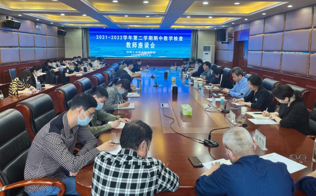 4月25日下午,学校2021-2022学年第二学期期中教学检查教师代表座谈会在行政楼四楼会议室召开。教务处、人事处、学生处、国有资产管理处、后勤管理处、信息化管理办公室、发展规划处、质量管理办公室、团委、产教融合中心、后勤服务中心、图书馆等部门负责人、校级督导员和41名教师代表参加了会议。副校长贾庆成出席并主持会议。