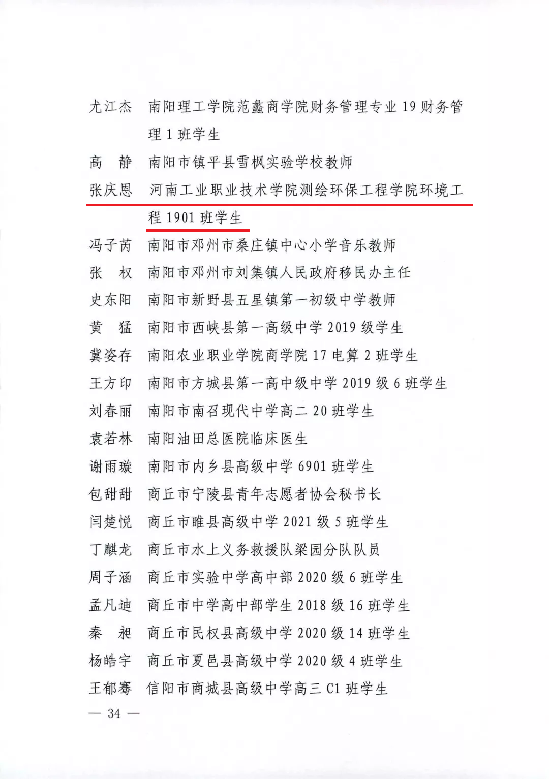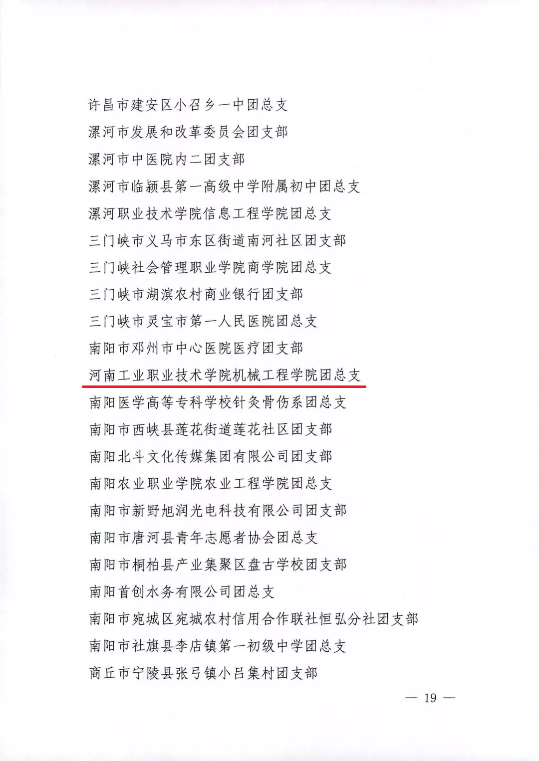 近日,共青团河南省委印发《关于表扬2021年度 “河南省五四红旗团委(团支部)”“河南省优秀共青团员”“河南省优秀共青团干部”的通知》,校团委被授予“河南省五四红旗团委”称号,机械工程学院团总支被授予“河南省五四红旗团支部(团总支)”称号,测绘环保工程学院环境工程1901班张庆恩同学被授予“河南省优秀共青团员”称号。