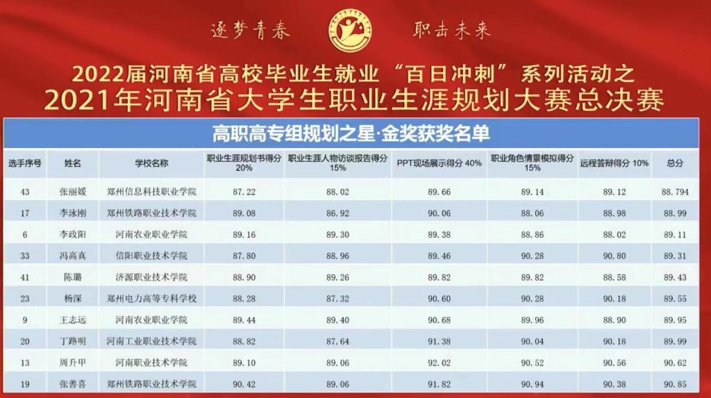 2022年5月20日,由河南省教育厅、河南省发展和改革委员会等七部门共同主办,郑州大学、河南省大中专学生就业服务中心共同承办的2021年全省大学生职业生涯规划大赛总决赛,经过两天的激烈角逐,圆满落下帷幕。