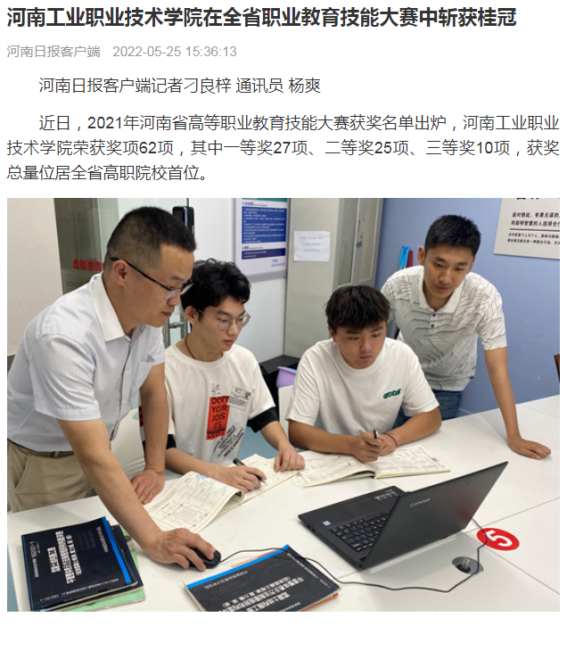 5月13日,河南省教育厅发布《关于公布2021年河南省高等职业教育技能大赛获奖名单的通知》(教职成〔2022〕149号),学校共荣获奖项62项,其中一等奖27项、二等奖25项、三等奖10项,整体获奖数量再创新高,位居全省高职院校首位。河南日报报道了学校构建技能竞赛三级体系,发挥技能竞赛在人才培养中的示范引领作用,为学生素质培养、技能提升和专业发展提供广阔平台的工作成效。(供稿/党委宣传部 撰稿/刘天恒 单位审核/杨俊峰 编审/杨爽)