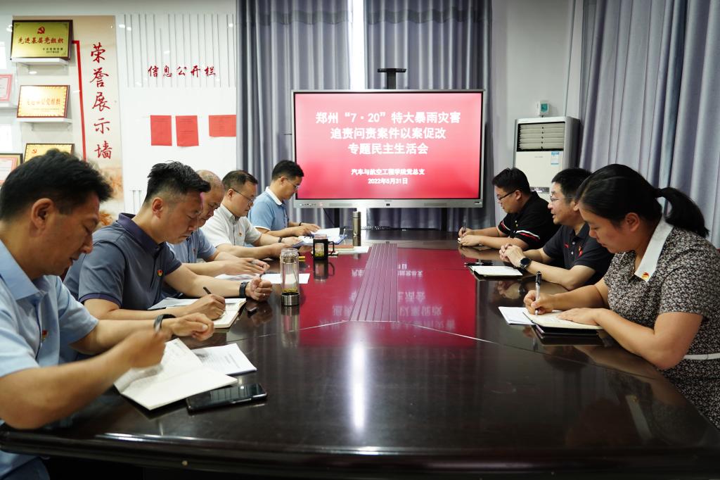 根据学校党委统一部署,5月31日下午,汽车与航空工程学院党总支在学院会议室2522召开郑州“7•20”特大暴雨灾害追责问责案件以案促改专题民主生活会。学校副校长王仁伟到会指导,专题民主生活会督导组成员杨爽、李森陪同,汽车与航空工程学院党总支支委全体成员参会,党总支书记王浩主持会议。