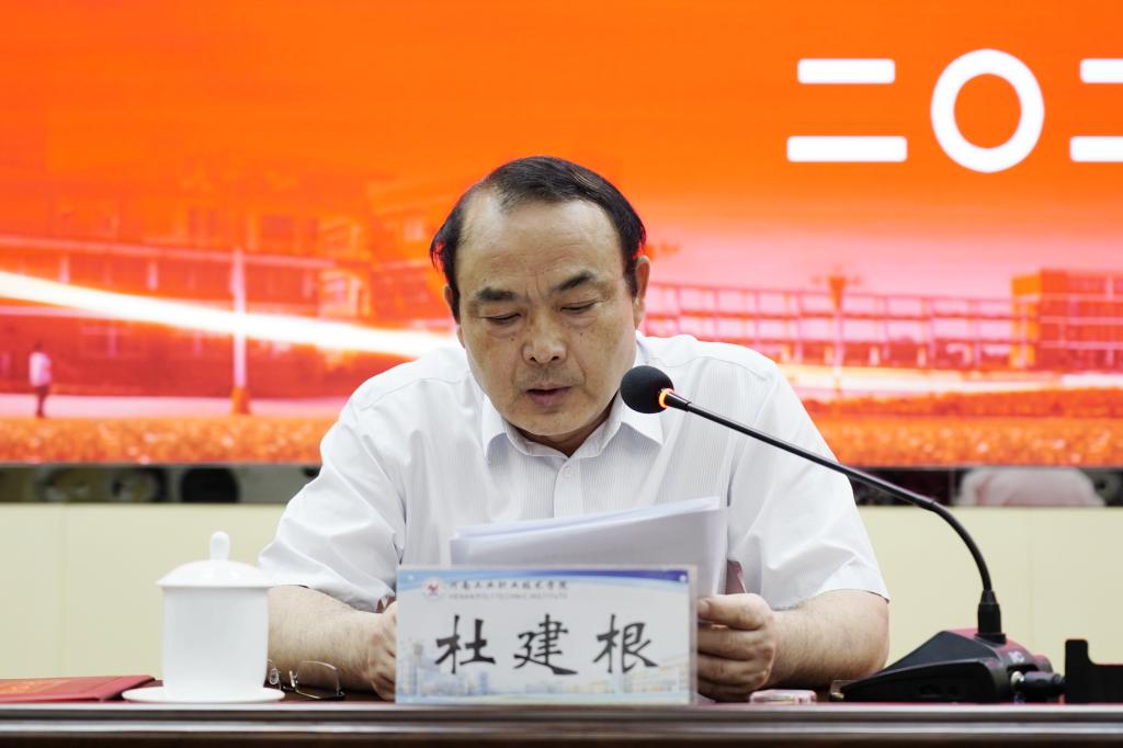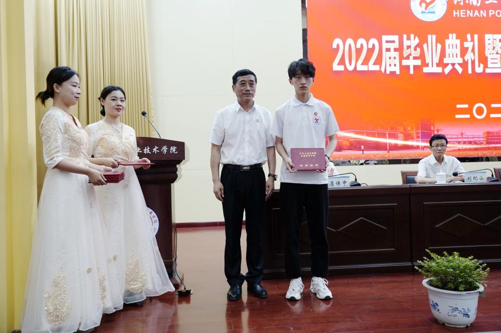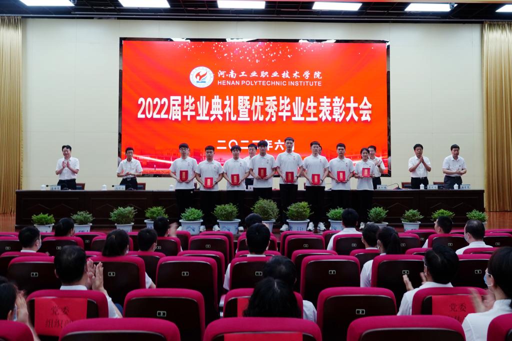 毕业典礼在雄壮的国歌声中拉开帷幕。副校长贾庆成介绍了2022届毕业生情况;党委副书记杜建根宣读了《河南省教育厅关于对2022年河南省优秀应届大中专毕业生名单的公示》和《河南工业职业技术学院关于表彰2022届优秀应届毕业生的决定》。在激昂欢快的乐曲声中,与会领导为2022届省级优秀毕业生、校级优秀毕业生代表颁发了荣誉证书。