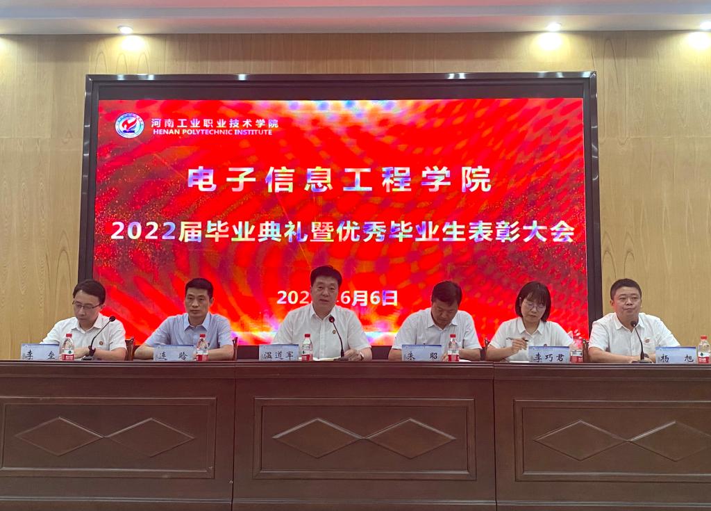 风好正是扬帆时,奋楫逐浪天地宽!6月6日下午,电子信息工程学院在T1127隆重举行2022届毕业生毕业典礼暨优秀毕业生表彰大会。学校党委书记温道军,电子信息工程学院党政领导、学院党政办、团总支、学工科、教学科、招生就业办负责同志,2022届毕业班班主任和各专业教师代表,2022届毕业生代表以及在校生代表参加大会,会议由学院党总支副书记杨旭主持。