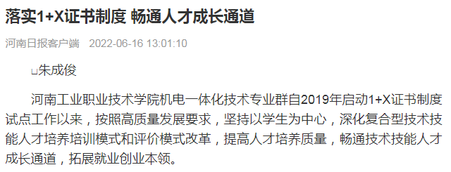 河南工业职业技术学院机电一体化技术专业群自2019年启动1+X证书制度试点工作以来,按照高质量发展要求,坚持以学生为中心,深化复合型技术技能人才培养培训模式和评价模式改革,提高人才培养质量,畅通技术技能人才成长通道,拓展就业创业本领。