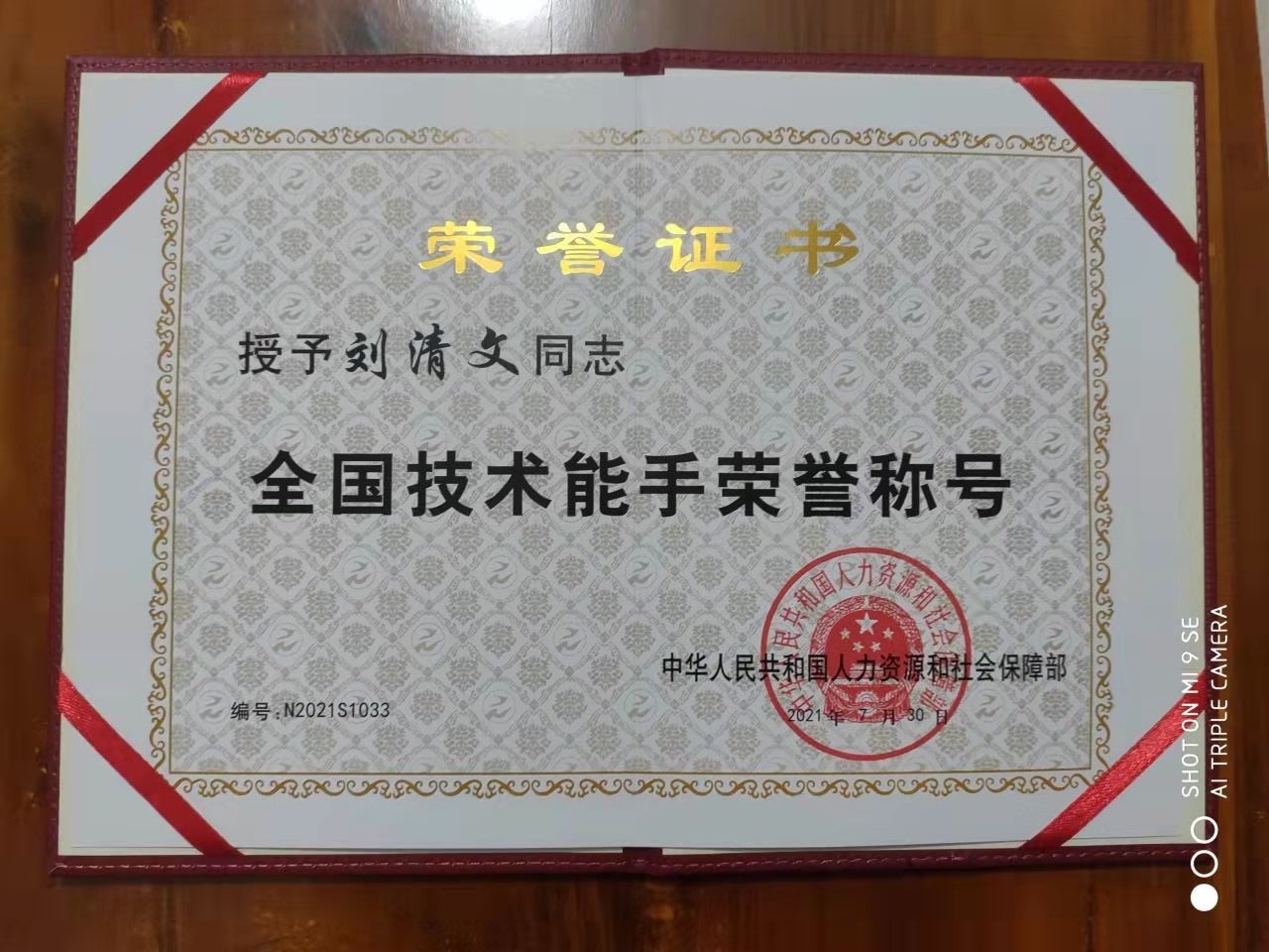 授予全国技术能手荣誉称号