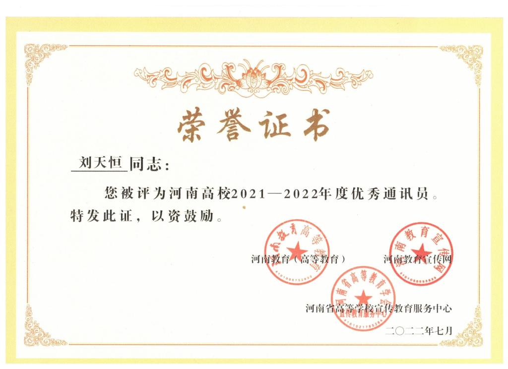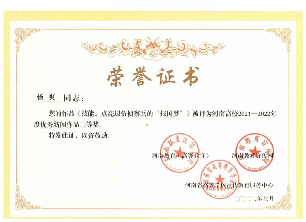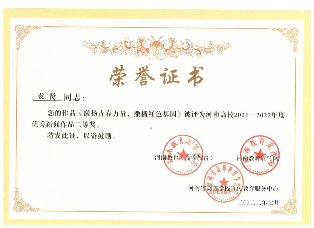 在本次评选中,我校党委宣传部宣传科科长刘天恒被评为河南高校2021-2022年度优秀通讯员,我校新闻作品《激扬青春力量,撒播红色基因》获得河南高校2021-2022年度优秀新闻作品二等奖,作品《技能,点亮退伍侦察兵的“报国梦”》获得优秀新闻作品三等奖。