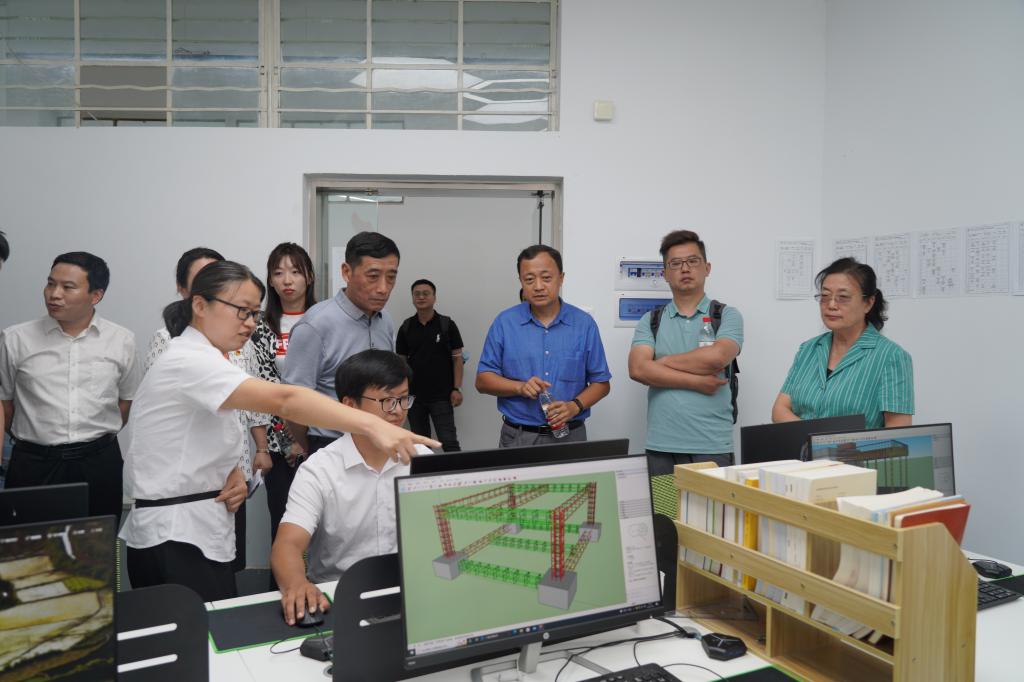 在光武路校区,专家组一行实地考察了学校建筑工程虚拟仿真实训基地的建设与运行情况,详细了解建筑工程虚拟仿真实训基地的硬件设施、软件配置、教学团队、实训项目、服务专业、开设课程、实训管理等,并与虚拟仿真实训团队的教师进行了深入交流。