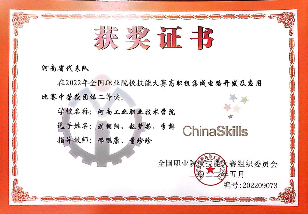 2022年全国职业院校技能大赛高职组“集成电路开发及应用”赛项于8月29日-8月31日在滨州职业技术学院举办,我校参赛队由电子信息工程学院院长连晗领队,邢鹏康、董珍珍老师指导,电子信息工程技术专业刘朝阳、赵梦茹、李想三名同学组成,代表河南省参加本次国赛。经过2天共计10个小时的激烈角逐,我校参赛队凭借扎实的专业知识和较强的实践能力从全国三十个省市(区)50余支参赛队中脱颖而出,荣获国赛二等奖。