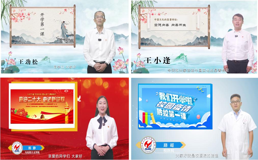 学校基础科学教学部王劲松主任通过阐释何谓大学、何谓大学之道、中国传统文学的基本特征、文学的积极作用,激发学生学习中国传统文学的兴趣,教育引导学生坚定文化自信,增强民族自豪感和认同感,进而扎根诗书、向上生长、崇德向善、向美而生。基础科学教学部王小逢老师围绕中华文化“崇德向善 向美而生”的显著特征,阐述赓续中华文明的重要意义,教育引导当代大学生继承、发扬优秀传统文化中的情怀、使命、担当。马克思学院郭静老师引带领学生了解二十大对党和国家的重要意义,引导学生从百年党史中汲取青春奋进力量,努力做强国新征程上的有为青年,鼓舞和激励学生以良好的精神面貌开启2022年秋季学期新征程,以奋进姿态喜迎党的二十大胜利召开。校医院路超医生围绕新冠肺炎疫情防控、健康科普、个人防护等方面做好教育引导,帮助广大学生增强防护意识、掌握防护技能,维护师生生命安全和身心健康。