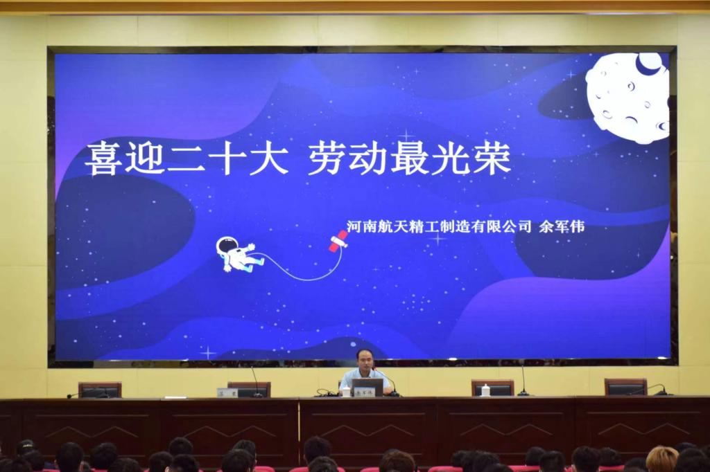 余军伟以《喜迎二十大 劳动最光荣》为题,以自身的成长经历、工作经历向广大新生讲述劳动精神,分享成功的经验。报告以劳动精神、成长经历、工作经历、成功经验分享四部分展开。