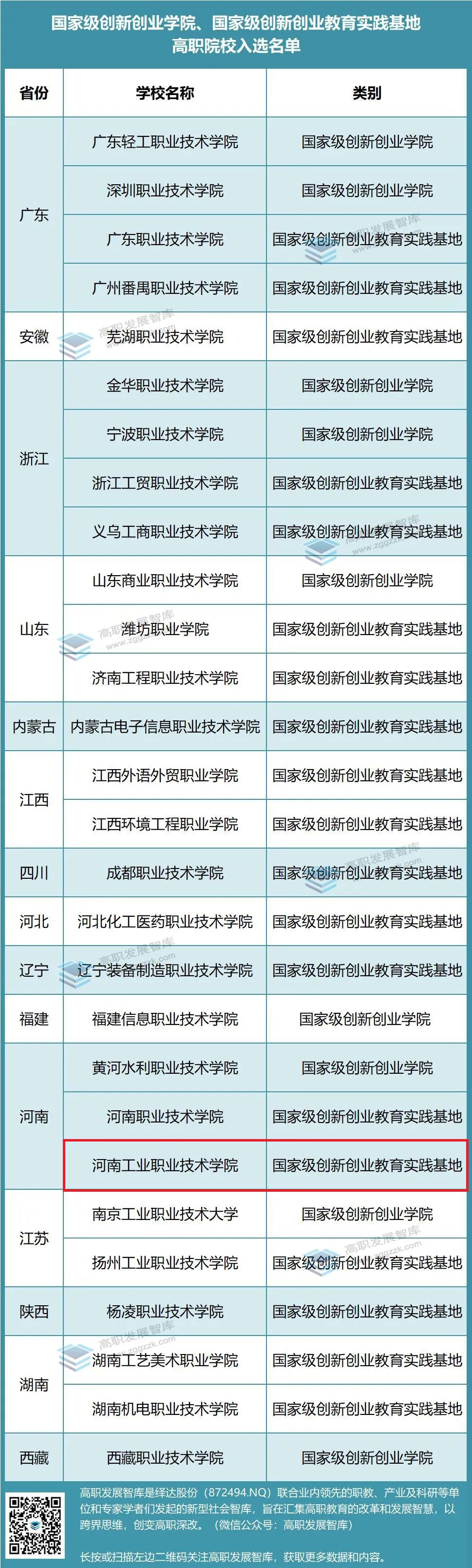 近日,教育部印发《教育部办公厅关于公布国家级创新创业学院、国家级创新创业教育实践基地建设名单的通知》(教高厅函〔2022〕22号),经过省级教育行政部门规划、高校自主申报、省级教育行政部门公示推荐、教育部审核,全国共有28所高职院校入选,其中9所高职院校入选国家级创新创业学院建设单位,19所高职院校入选国家级创新创业教育实践基地建设单位。首批国家级双创学院、实践基地来自全国15个省份,其中,浙江、广东各4所高职院校入选,山东、河南各3所高职院校入选,江苏、江西、湖南各2所高职院校入选。河北、内蒙古等8省各1所高职院校入选。