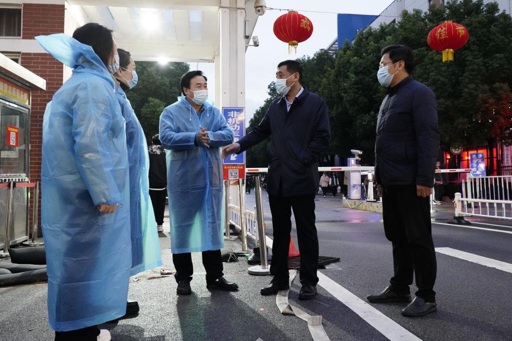 王伟一行先后来到孔明路校区南门、东门,慰问正在值班的中层干部和保卫工作人员,询问了解值班人员值守情况、防控措施落实情况,叮嘱值班值守人员在紧张工作的同时要注意防寒保暖,合理调配值班。在查看东门商户经营情况后,王伟叮嘱商户们要严格落实疫情防控各项措施,履行好食品安全主体责任,确保学生“舌尖上的安全”。