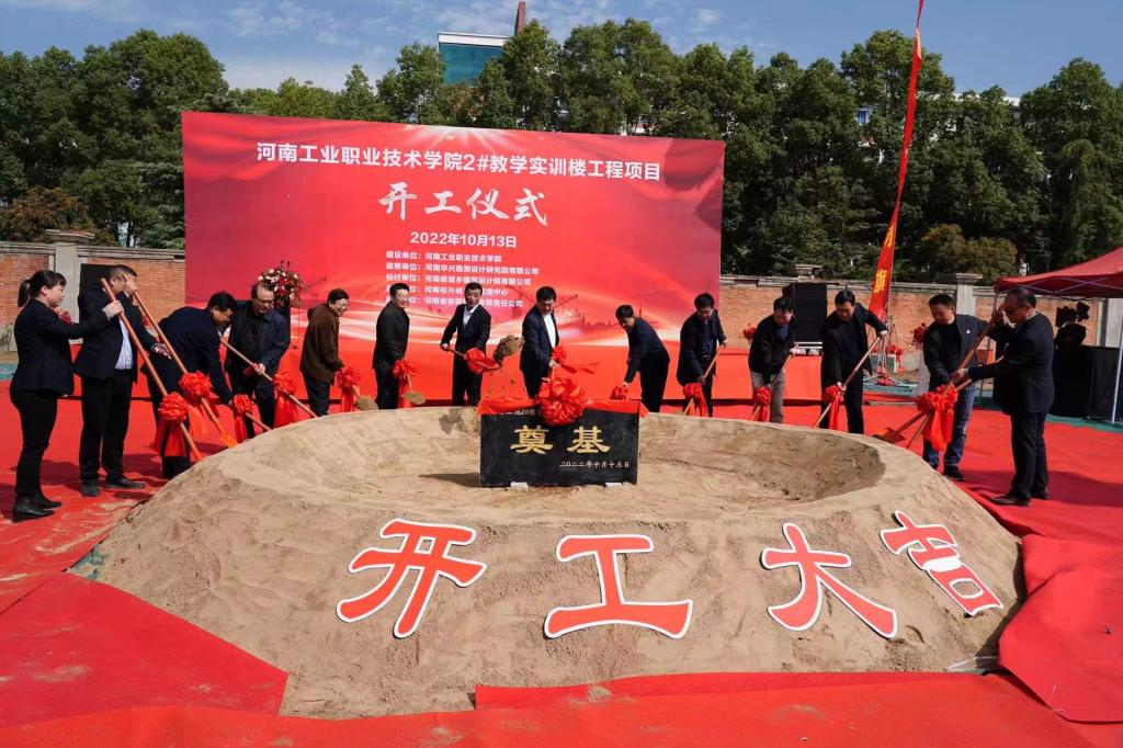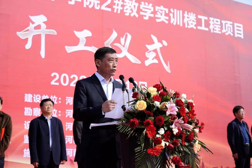 10月13日上午,孔明路校区2#教学实训楼项目举行开工奠基仪式,学校全体校领导、宛城区汉冶街道党工委书记范涛、河南省安装集团有限责任公司副总裁王致祥、河南裕兴诚工程管理中心总经理杨献元、学校相关单位负责人参加了开工仪式。仪式由党委副书记杜建根主持,党委书记温道军宣布项目正式开工,校长王伟致辞。