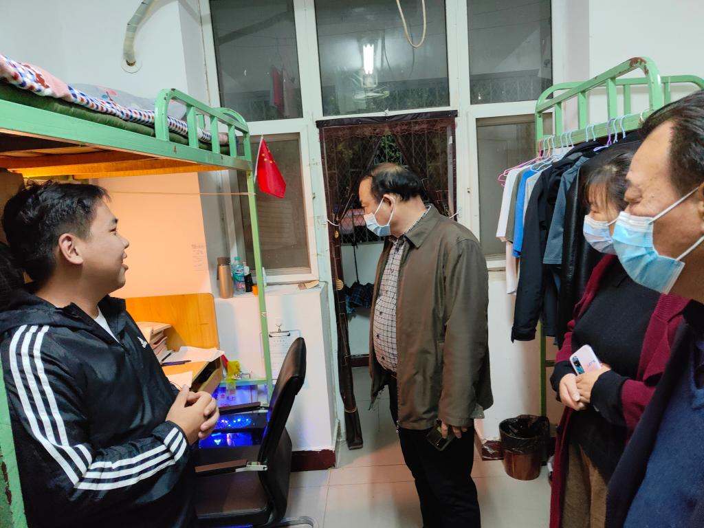 10月15日晚,校党委副书记杜建根带领值班中干、机械工程学院朱成俊院长、党总支副书记苏君和辅导员老师深入机械工程学院宿舍,看望周末在校学生,检查周末外出学生返校情况。