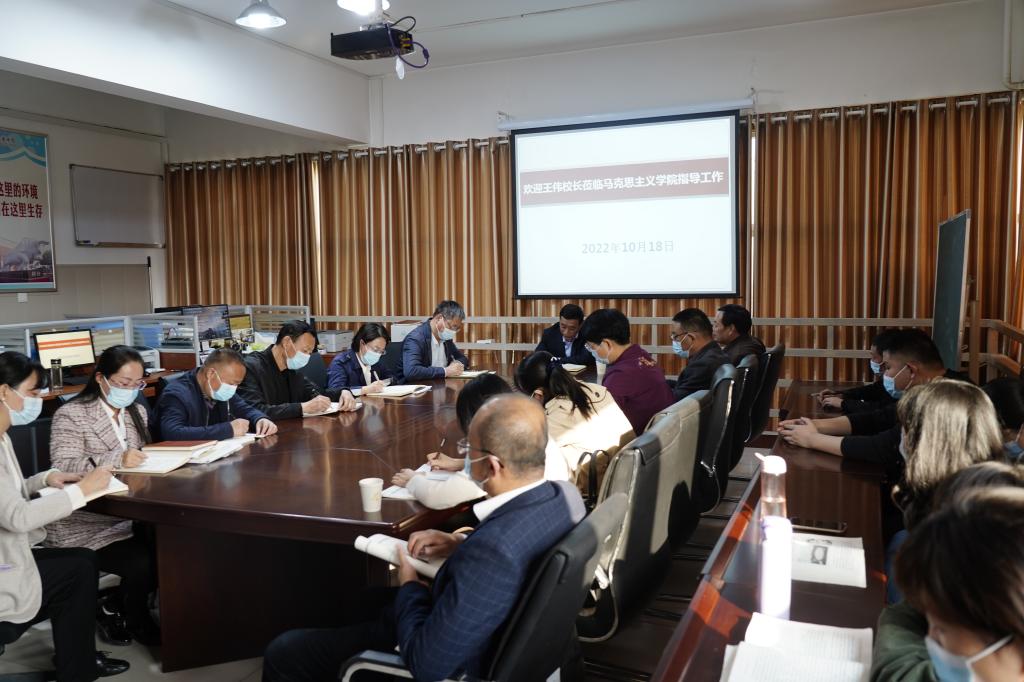 2022年10月18日下午,校长王伟到马克思主义学院进行现场办公,副校长、马克思主义学院院长樊有平、马克思主义学院常务副院长王顺旭和全体专职教师参加会议。