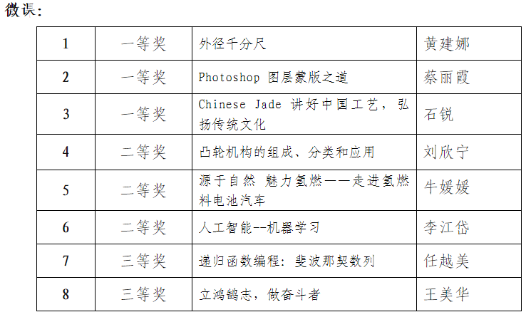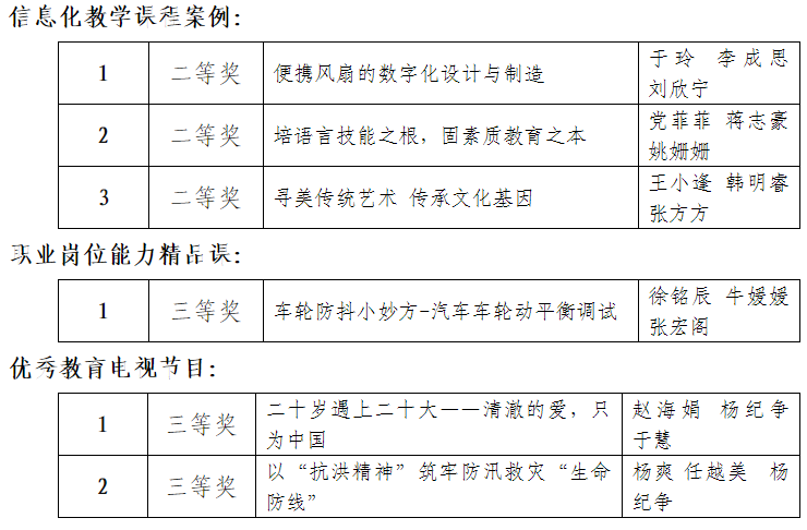 经过全省各单位遴选申报、教育厅组织专家评审,我校在职业教育组课件中获得三等奖2项;在职业教育组微课中获奖8项,其中一等奖3项,二等奖3项,三等奖2项;职业教育组信息化教学课程案例获得二等奖3项;职业教育组职业岗位能力精品课获得三等奖1项;职业教育组优秀教育电视节目中获得三等奖2项。望广大教师和教学单位进一步重视和深入开展教学研究,不断提升教学水平和信息化技术运用水平,促进教学质量不断提高。