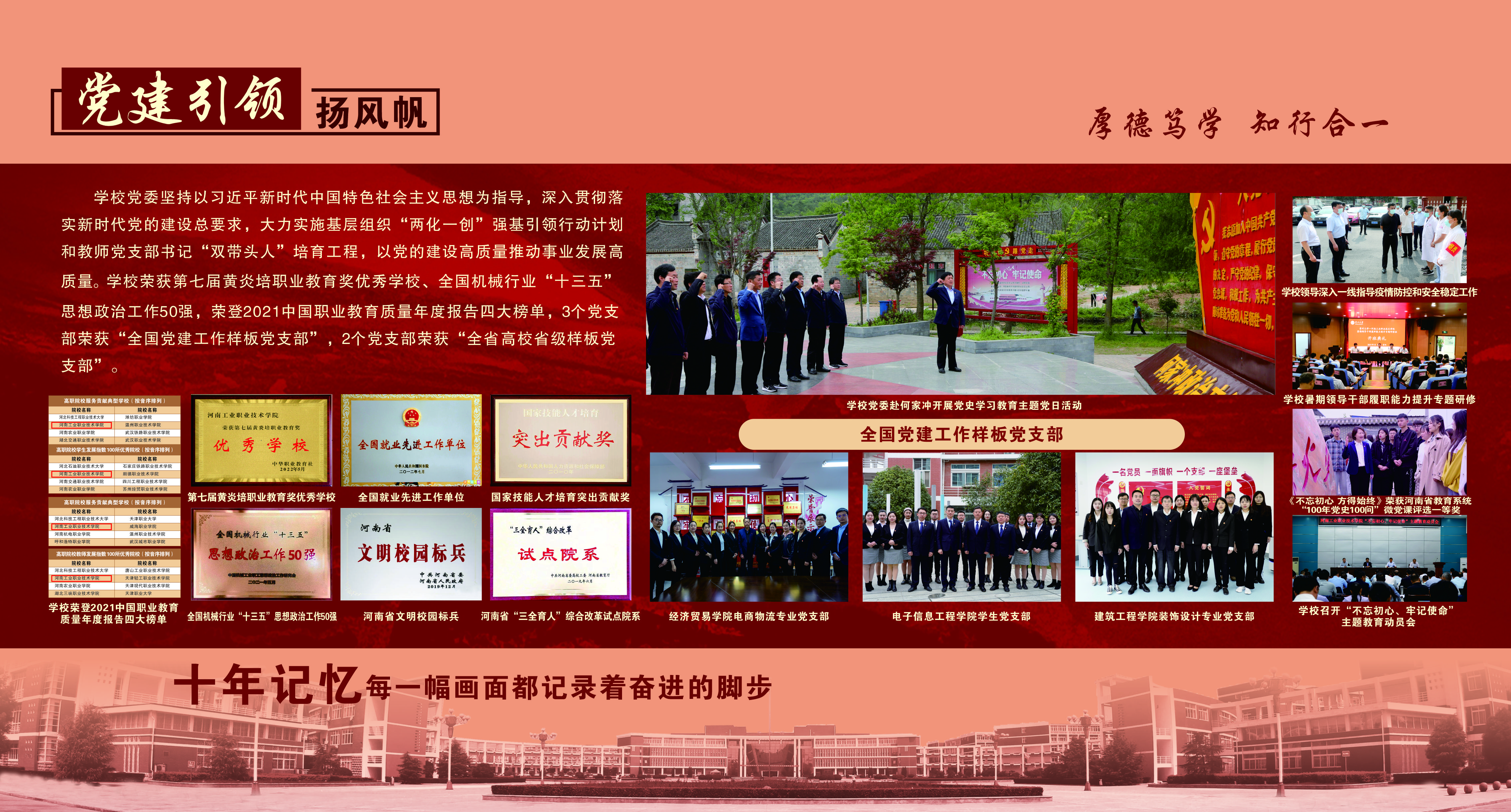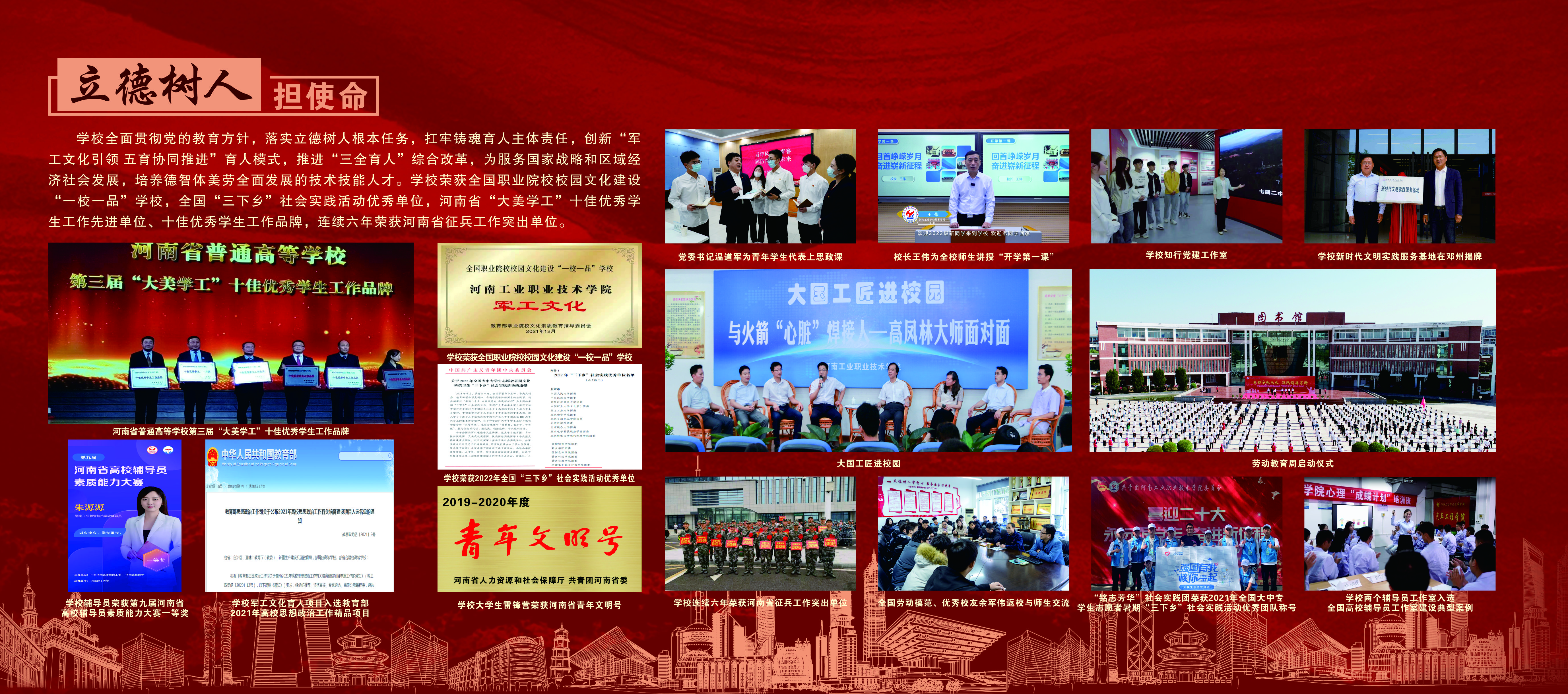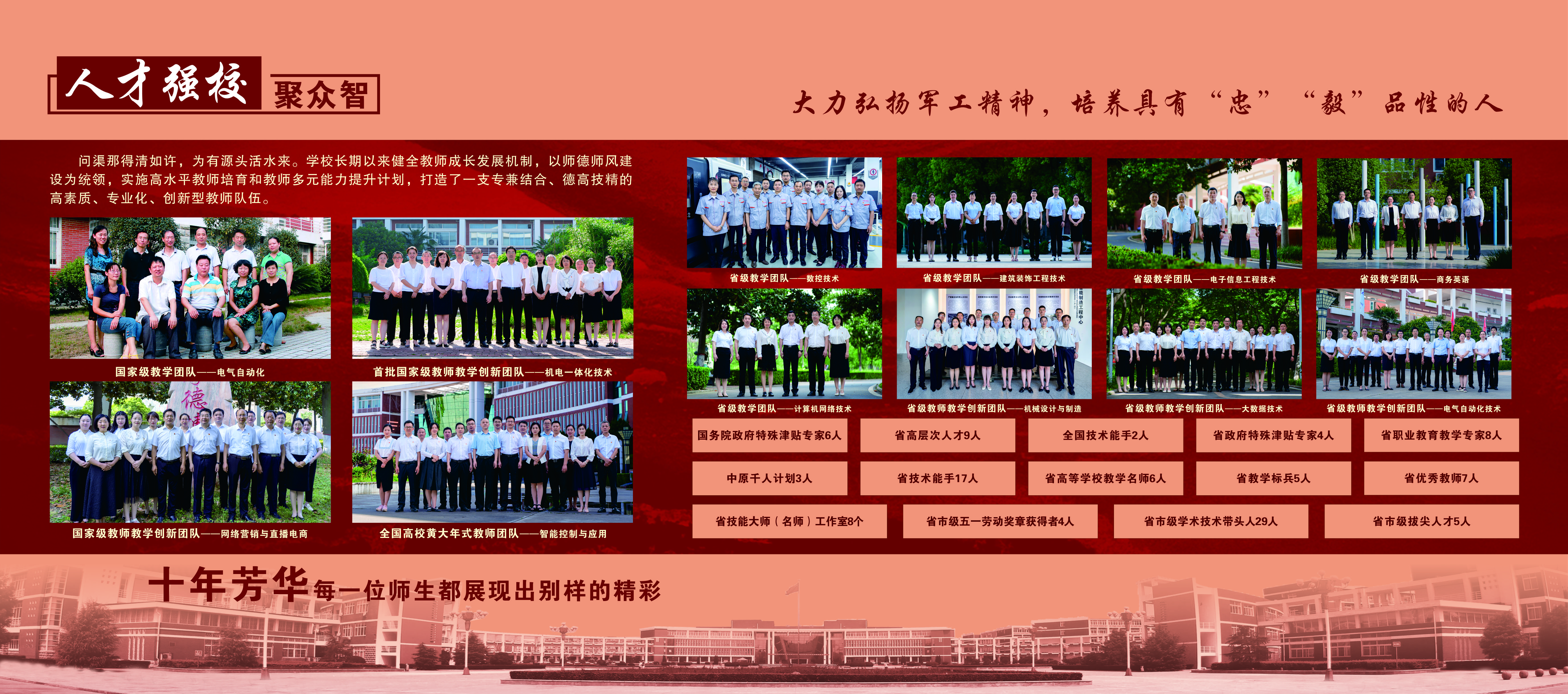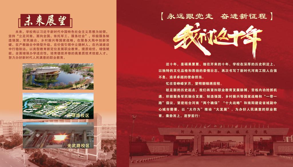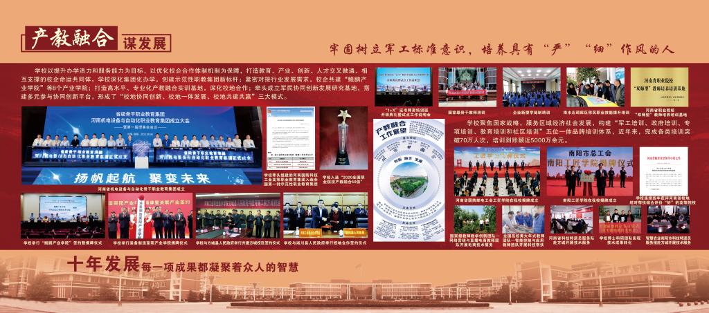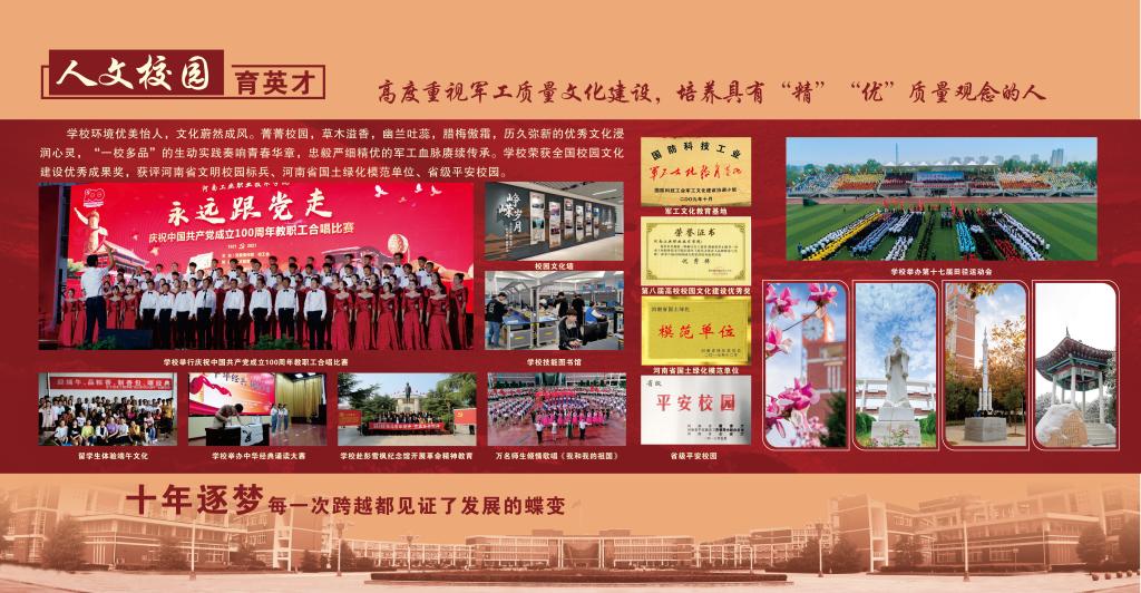 编者按:为了营造“永远跟党走 奋进新征程”的浓郁氛围,切实发挥宣传思想工作“举旗帜、聚民心、育新人、兴文化、展形象”作用,近日,党委宣传部筹备制作“我们这十年”办学成果展,展览设置“党建引领扬风帆”“立德树人担使命”“人才强校聚众智”“教学科研深耕耘”“技能大赛展风采”“产教融合谋发展”“就业创业拓新路”“人文校园育英才”等版块,精选反映学校改革发展历程的图文材料,全方位展示学校十年来砥砺前行、跨越发展的丰硕成果,生动展示学校广大师生在军工精神的引领下,用智慧和汗水谱写学校事业高质量发展的绚丽篇章。(供稿/党委宣传部 图文汇编/杨爽 单位审核/杨俊峰 编审/袁贤)