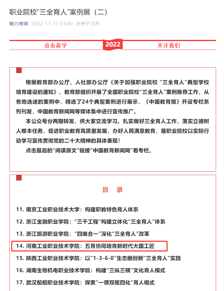 2022年,教育部办公厅、人社部办公厅印发《关于加强职业院校“三全育人”典型学校培育建设的通知》,组织开展了全国职业院校“三全育人”案例推荐工作,从全国各地选送的143例“三全育人”学校典型案例中,精选24个典型案例进行展示,我校选送的“五育协同培育新时代大国工匠”成功入选。