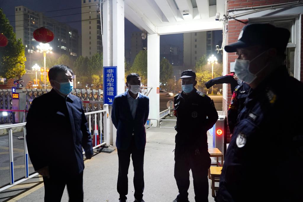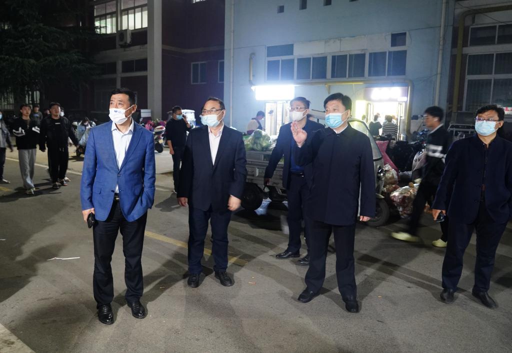 根据南阳市疫情防控工作安排,按照属地管理要求,学校实行静态管理。11月10日晚,党委书记温道军、校长王伟、党委副书记杜建根、纪委书记李荣胜,带领学校疫情防控九个工作专班负责人,深入孔明路校区,督查指导疫情防控各项工作落实情况。