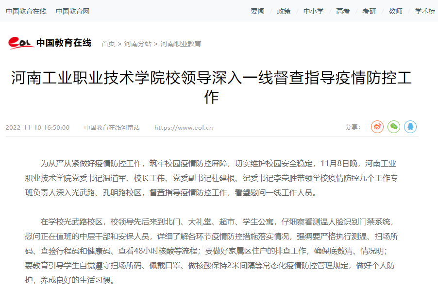 编者按:为从严从紧做好疫情防控工作,筑牢校园疫情防控屏障,切实维护校园安全稳定,11月8日晚,学校党委书记温道军、校长王伟、党委副书记杜建根、纪委书记李荣胜带领学校疫情防控九个工作专班负责人深入光武路、孔明路校区,督查指导疫情防控工作,看望慰问一线工作人员,并召开疫情防控分析研判会议,安排部署下一步校园疫情防控工作。近日,《中国教育在线》详细报道了校领导深入一线督查指导疫情防控工作情况。(供稿/党委宣传部 撰稿/刘天恒 单位审核/杨俊峰 编审/杨爽)