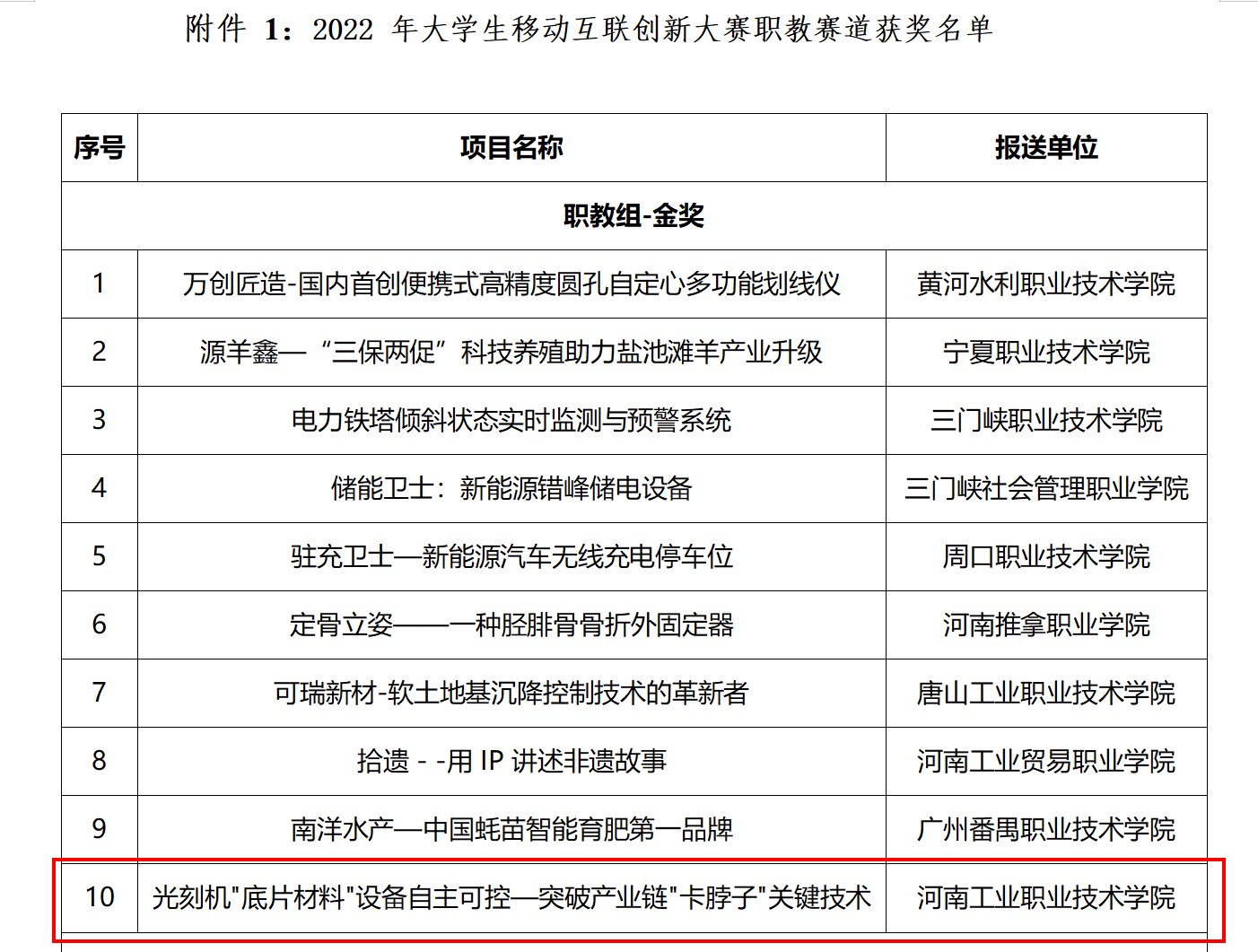 2022年11月10日,由中关村中科创新创业教育基金会主办,中科创大(北京)教育科技有限公司承办,未来空间(广东)科技开发有限公司、郑州大学、河南大学、华中师范大学、广西大学等共同协办的2022年大学生移动互联创新大赛总决赛,经过两天的激烈角逐,圆满落下帷幕。我校选手的《光刻机“底片材料”设备自主可控——突破产业链卡脖子技术》荣获金奖。