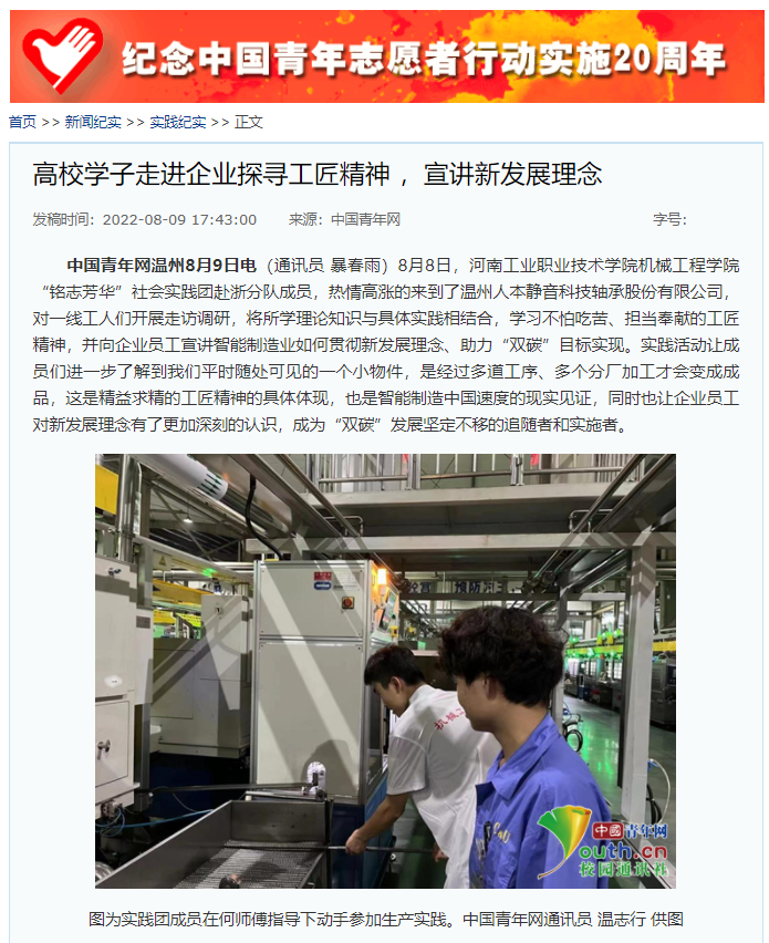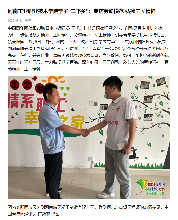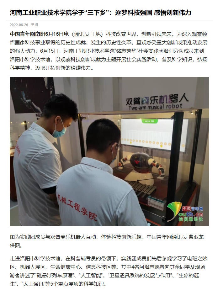 近日,由共青团中央青年发展部、中国青年报、中国青年网共同举办的2022年全国大中专学生志愿者暑期文化科技卫生“三下乡”社会实践“镜头中的三下乡”优秀成果遴选活动结果公布通报,我校“铭志芳华”社会实践团在此次活动中获评“优秀文字报道团队”,机械工程学院王旭老师获评“优秀指导教师”,数控2002班郭文博同学获评“优秀通讯员”,这是我校首次获得此项荣誉。