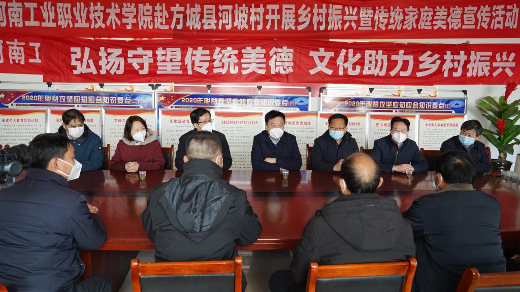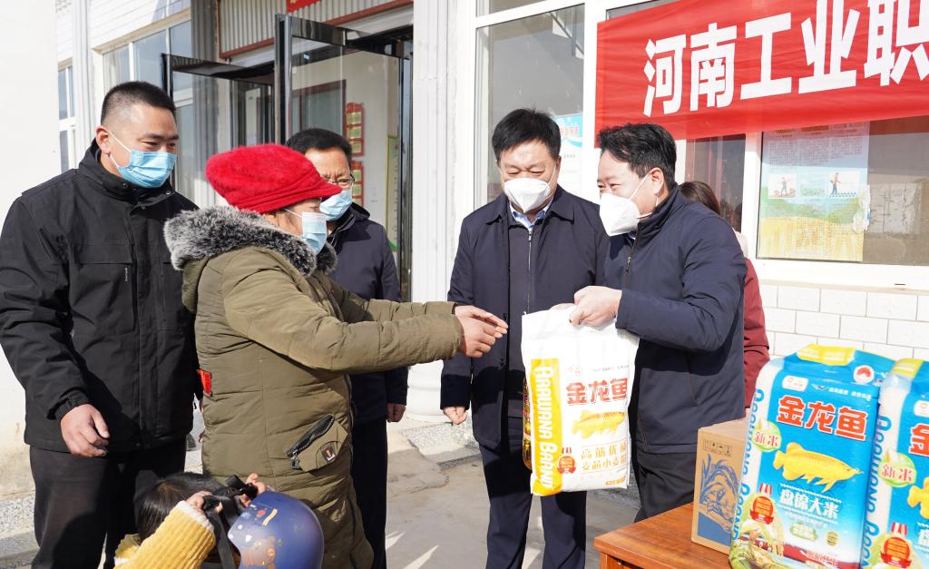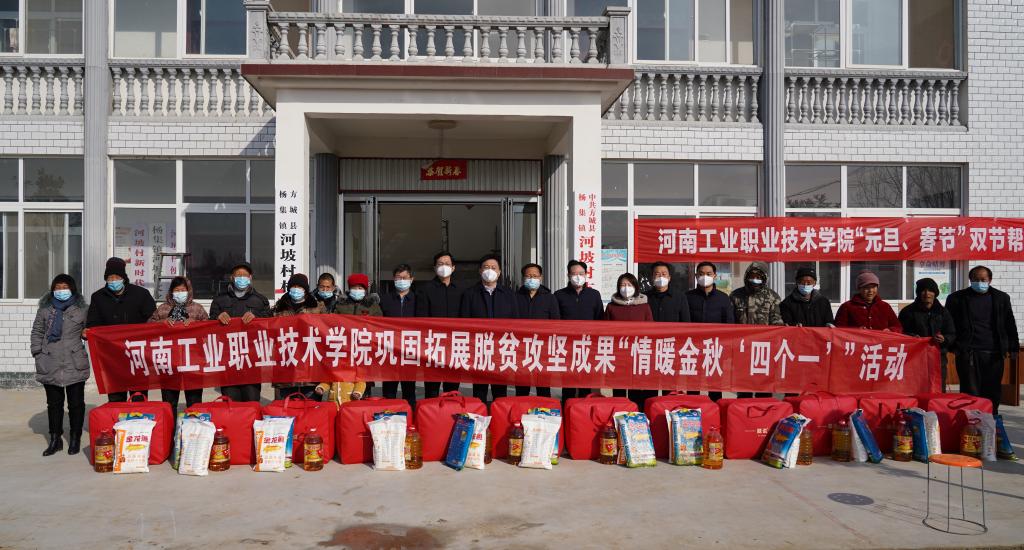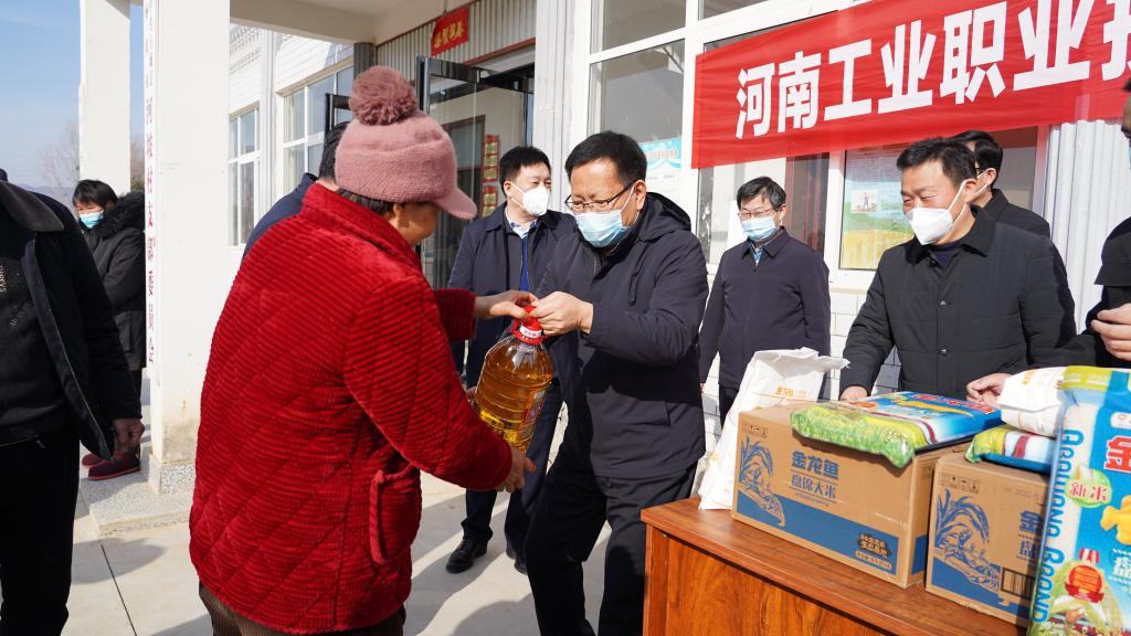 12月29日上午,学校党委书记温道军,党委委员、工会主席屈保中在方城县委常委、宣传部部长、副县长岳太斌,县委常委、县委办主任温阳,杨集镇镇长冯冰,镇党委副书记杨兆增,镇纪委书记董向普等的陪同下,到学校定点帮扶村方城县杨集镇河坡村开展“元旦、春节”双节帮扶慰问暨“四送一助力”活动。学校党政办公室、党委组织部、党委宣传部、驻方城县乡村振兴局相关同志一同参加慰问活动。