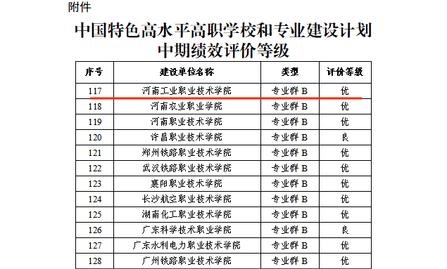 日前,教育部职业教育与成人教育司发布《关于中国特色高水平高职学校和专业建设计划中期绩效评价结果的公示》,根据《教育部办公厅财政部办公厅关于开展中国特色高水平高职学校和专业建设计划中期绩效评价工作的通知》(教职成厅函〔2022〕10号)要求,经综合评议,确定了全国197所建设单位的评价等级,我校在“双高计划”建设中期绩效评价中获评优秀。