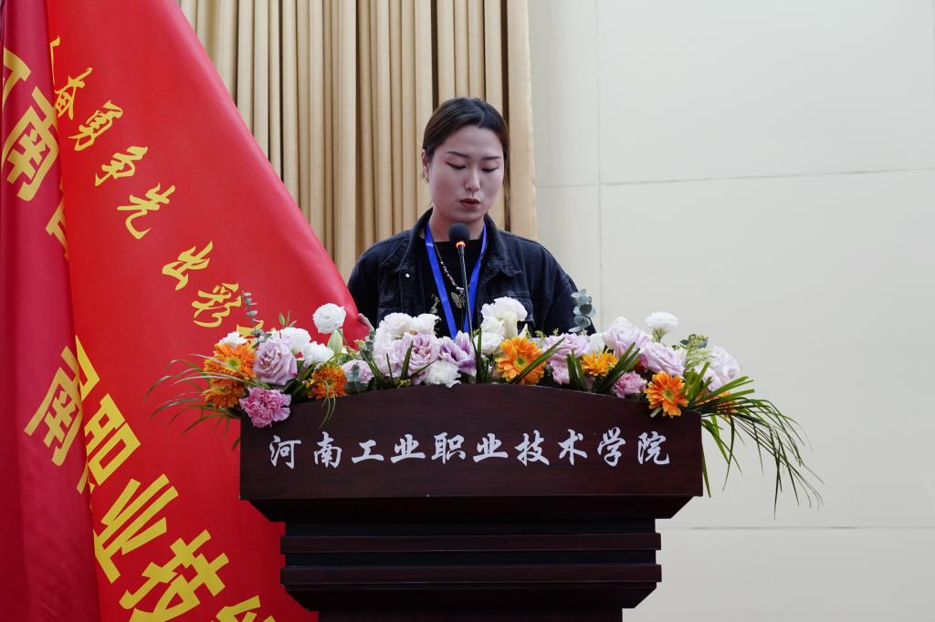 南阳市人民政府向举办院校代表河南工业职业技术学院授旗。裁判员代表郝倩、参赛选手代表姚飞燕分别代表裁判员和参赛选手庄严宣誓。刘江宣布大赛正式开幕。