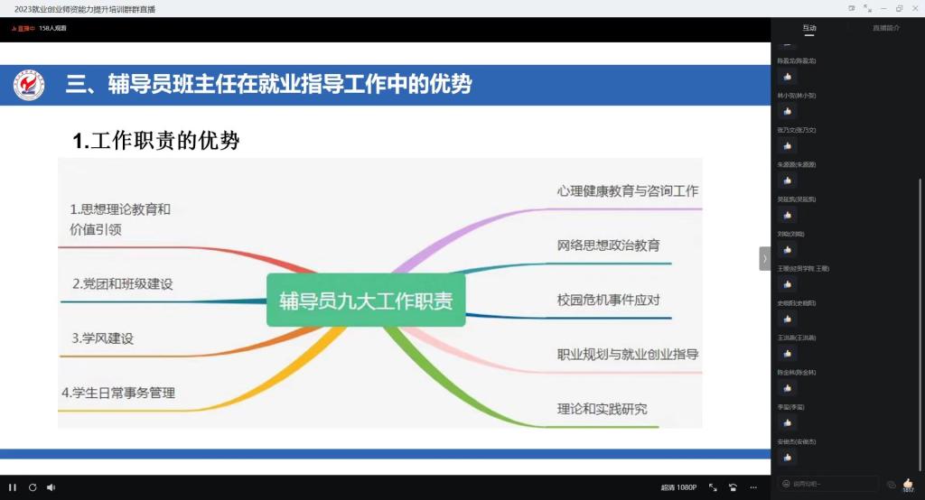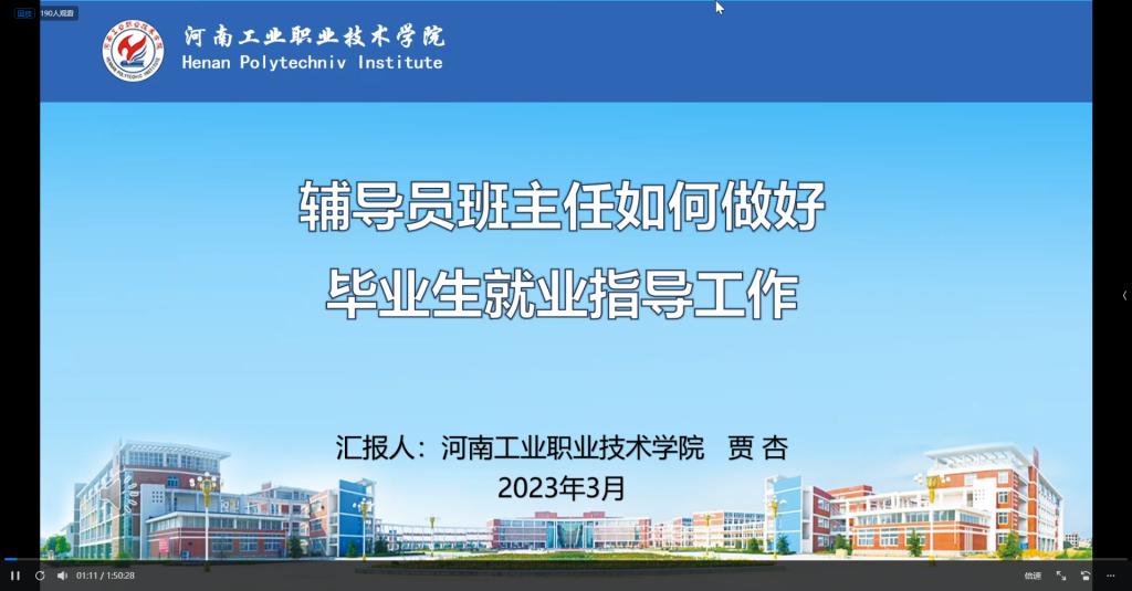 线上集中培训,于3月6日晚通过钉钉群直播,测绘环保工程学院贾杏书记做了“班主任与辅导员如何做好就业指导工作”主题培训。毕业班班主任、辅导员及其他教师近200人进行了实时观看。培训围绕辅导员、班主任开展就业指导工作的意义、在就业指导工作中的现状及存在的问题、就业指导工作中的优势及方法和策略进行了详细的讲解。贾书记准备充分,培训内容紧贴我校实际、丰富充实,精彩细致、生动形象地讲解受到老师们热烈点赞。