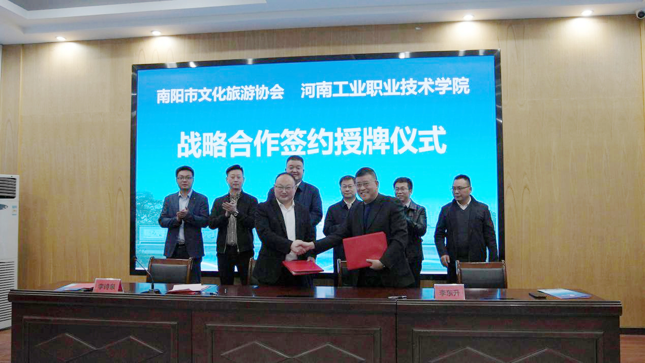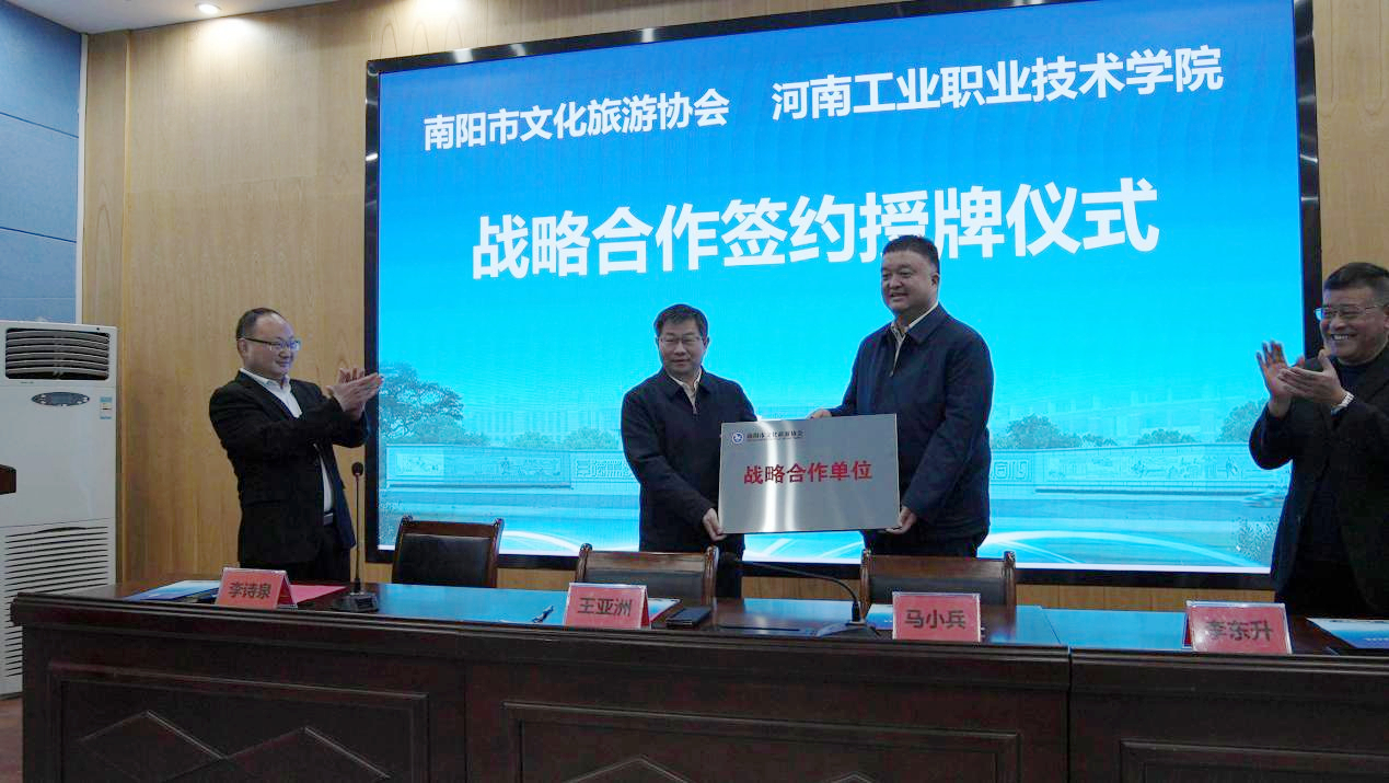 李诗泉与李东升代表双方进行校企战略合作签约,马小兵、王亚洲代表学校和南阳市文化旅游协会分别授予“河南工业职业技术学院实习就业基地”和“战略合作伙伴单位”牌匾,双方的合作在热情友好的氛围中取得了成功。