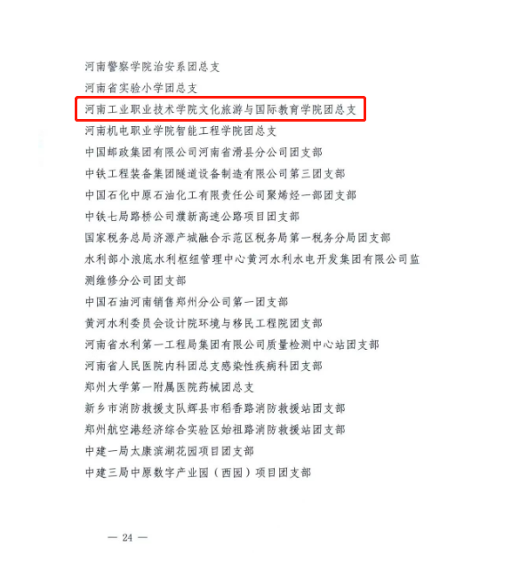 2023年4月,共青团河南省委下发关于表扬河南省“两红两优”的决定,授予245个团组织河南省五四红旗团支部称号,学校文化旅游与国际教育学院团总支光荣上榜。