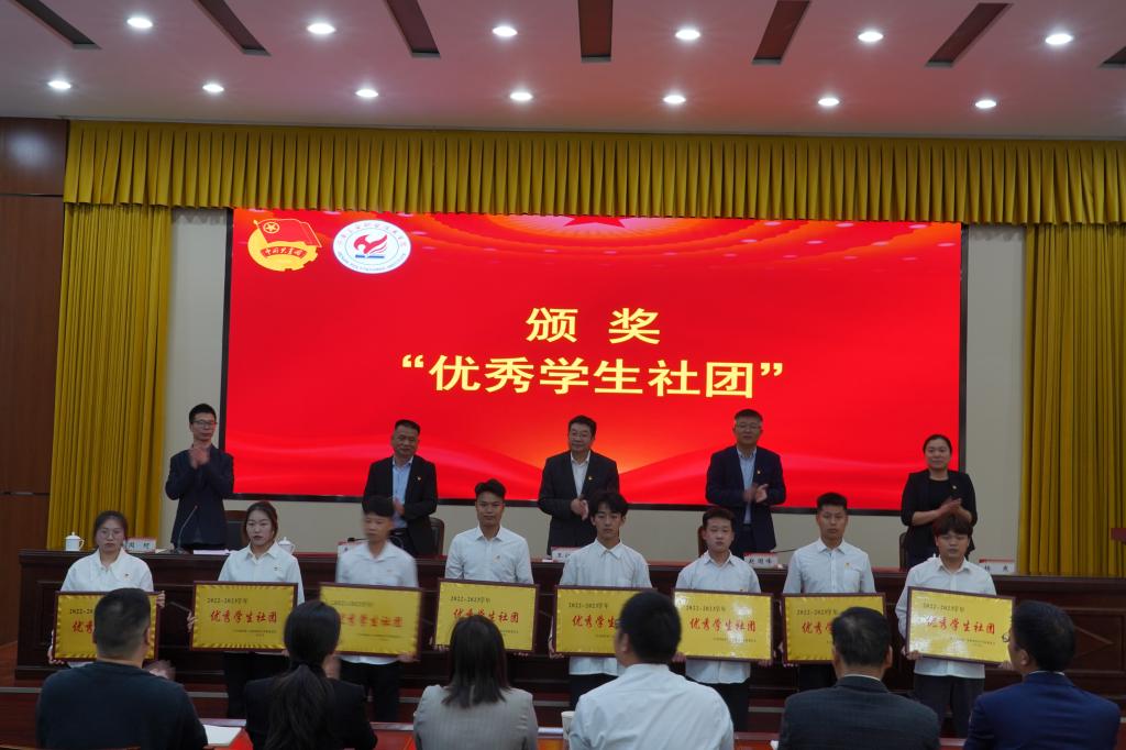 表彰大会上,党委学生工作部部长赵国峰宣读表彰决定,与会领导为获得2022年度五四红旗团总支、五四红旗团支部、优秀学生社团、优秀共青团干部、青年岗位能手、优秀共青团员、青年大学习标兵、志愿服务先进个人、社团工作先进个人等先进集体和先进个人颁发奖牌和证书。建筑工程学院团总支书记朱宗海和自动化工程学院学生靳开放分别代表优秀团干和优秀团员作了交流发言。