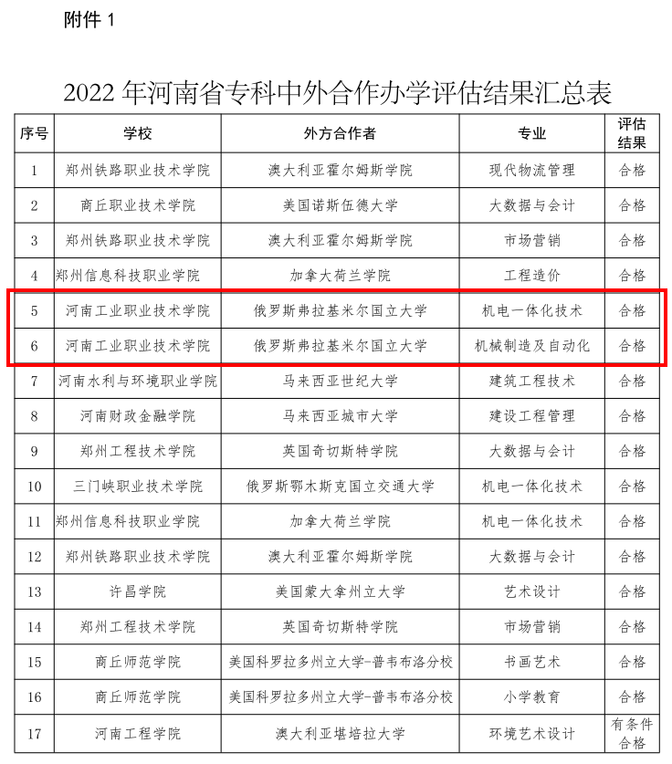 5月9日,河南省教育厅公布了2022年专科中外合作办学评估结果,2022年专科中外合作办学有29个项目参加评估,其中16个项目评估结果为“合格”,12个项目评估结果为“有条件合格”,1个项目评估结果为“不合格”。我校与俄罗斯弗拉基米尔国立大学合作举办的机电一体化技术、机械制造及自动化2个专业的中外合作办学项目评估结果为“合格”。