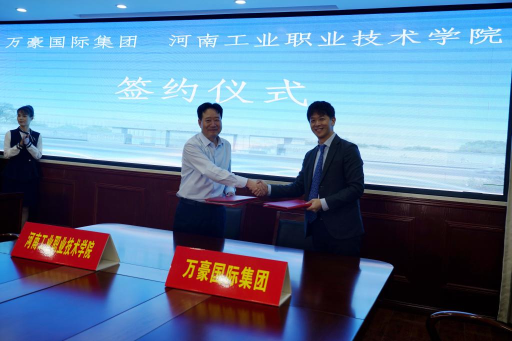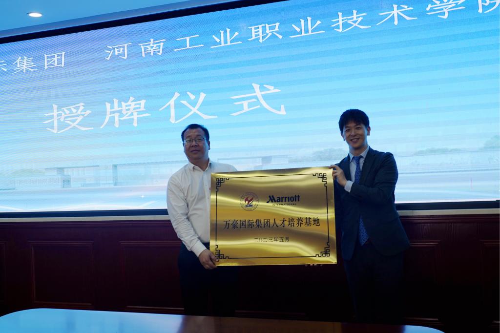 屈保中与朱程代表双方进行校企战略合作签约,并代表学校和万豪国际集团分别授予“河南工业职业技术学院实习就业基地”牌匾和“万豪国际集团人才培养基地”牌匾,双方的合作在热情友好的氛围中取得了成功。