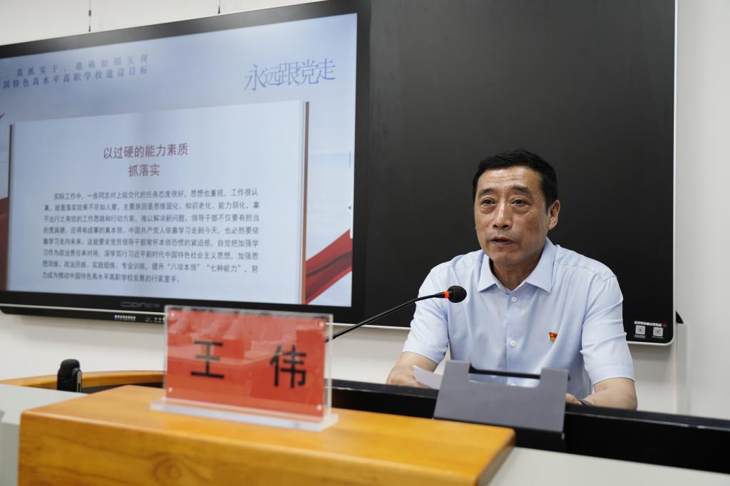 在全党开展学习贯彻习近平新时代中国特色社会主义思想主题教育之际,2023年5月16日,校长王伟以《深入学习贯彻习近平总书记关于职业教育的重要论述,为建设中国特色高水平高职学校而拼搏奋斗》为题,在光武路校区社区学院教室为财务党支部和建筑工程学院党总支上党课。党政办公室、党委组织部、党委宣传部、发展规划处相关领导参加党课学习。