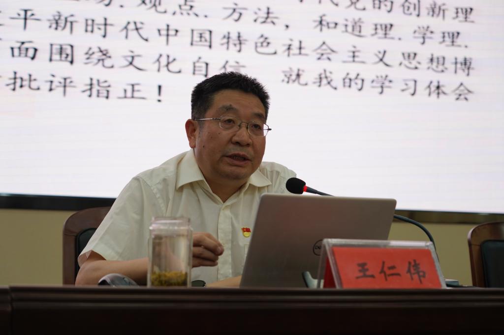 王仁伟结合学习习近平新时代中国特色社会主义思想和党的二十大精神体会,以《学习创新理论、坚定文化自信》为题,从习近平总书记在党的二十大报告中“推进文化自信自强”的重要论述出发,围绕“关于文化”“关于文化自信”“当今文化不自信的种种表现”“坚定文化自信”四个方面,层层递进,深入浅出地阐释了文化自信的科学内涵、功能作用和建设路径。指出,文化自信是对中国共产党领导下的中华民族价值取向的自信,是对优秀传统文化的传承和创新,实现中华民族伟大复兴的中国梦,物质财富要极大丰富,精神财富也要极大丰富。当前我们正处在中华民族伟大复兴的战略全局和世界百年未有之大变局中,在新时代的伟大征程上,要以开展主题教育为契机,牢牢把握“学思想、强党性、重实践、建新功”总要求,将总要求贯穿主题教育全过程,全面学习领会习近平总书记关于文化建设的重要论述,团结引导广大师生切实担负起推进社会主义文化强国建设的使命任务,为中华民族伟大复兴贡献力量。