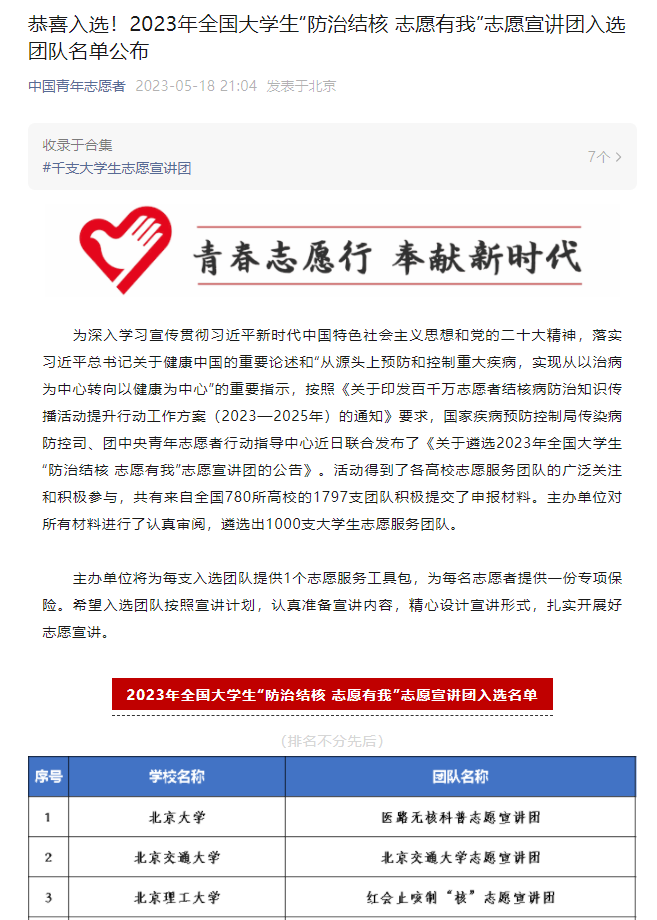 为深入学习宣传贯彻习近平新时代中国特色社会主义思想和党的二十大精神,落实“强国复兴有我”群众性主题宣传教育活动相关要求,引导动员青年学生大力弘扬井冈山精神,团中央青年志愿者行动指导中心、全国青少年井冈山革命传统教育基地、井冈山管理局近日联合发布了《关于遴选2023年全国大学生井冈山精神志愿宣讲团的公告》。为落实习近平总书记关于健康中国的重要论述和“从源头上预防和控制重大疾病,实现从以治病为中心转向以健康为中心”的重要指示,按照《关于印发百千万志愿者结核病防治知识传播活动提升行动工作方案(2023—2025年)的通知》要求,国家疾病预防控制局传染病防控司、团中央青年志愿者行动指导中心近日联合发布了《关于遴选2023年全国大学生“防治结核 志愿有我”志愿宣讲团的公告》。