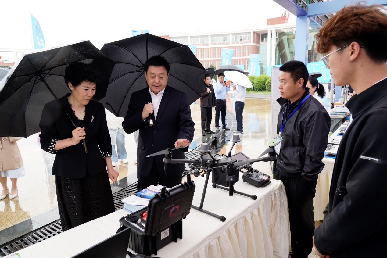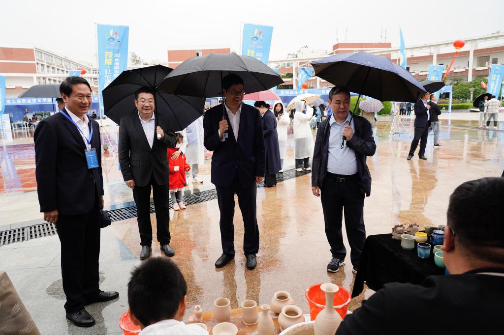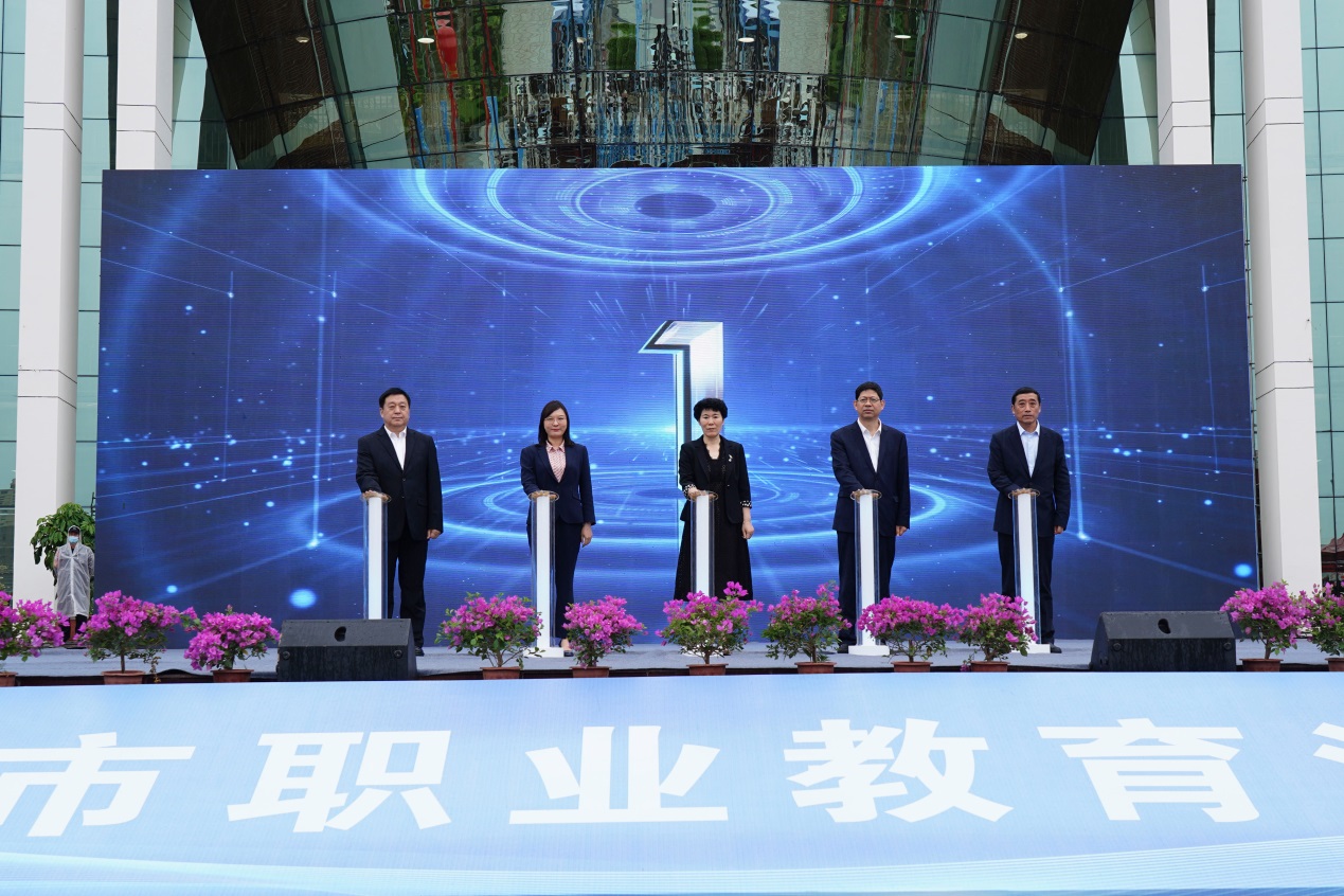南阳市政府副市长阿颖,南阳市政协副主席、市教育局党组书记、局长杨文普,南阳市政府副秘书长李菡,学校党委书记温道军、校长王伟共同为2023年南阳市职业教育活动周按下启动键