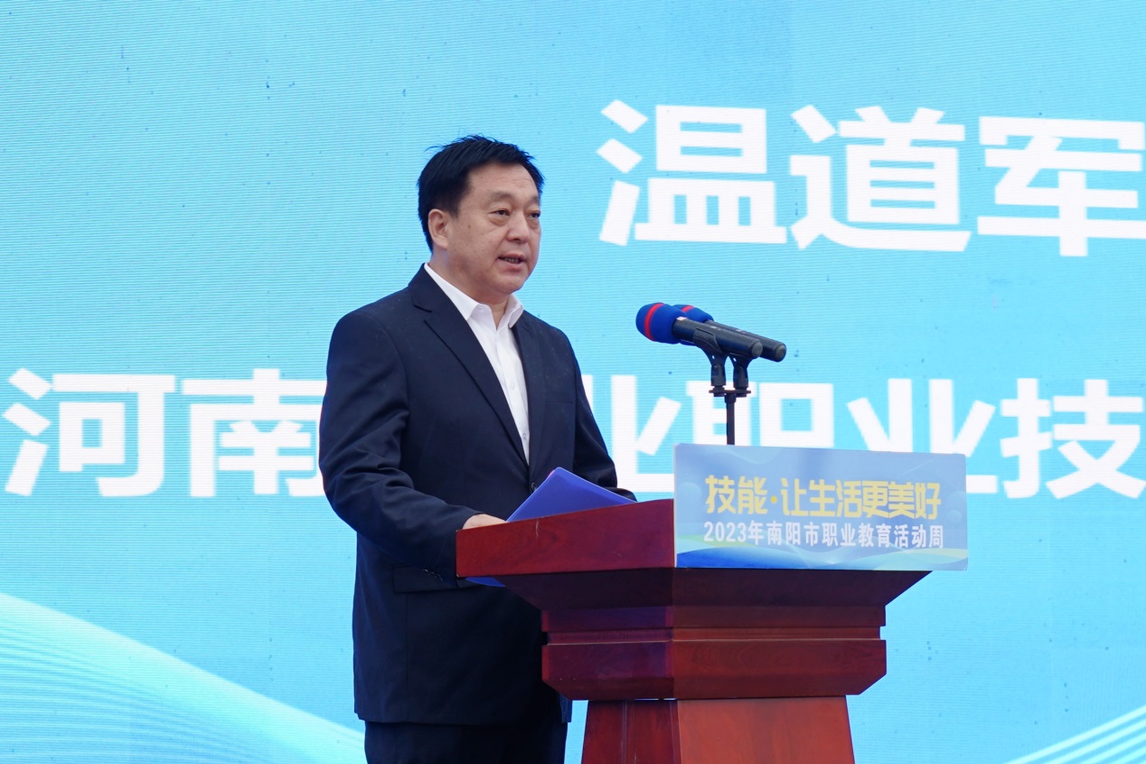 温道军代表学校向各位领导、各位来宾的到来表示热烈的欢迎!向2023年南阳市职业教育活动周的举办表示热烈祝贺!向长期以来关心支持学校发展的各级领导和各界朋友表示衷心的感谢!他指出,建校50年来,学校始终坚持质量立校、改革兴校、特色强校,紧紧围绕服务制造强国、军民融合等国家战略和省市经济社会发展需要,持续深化产教融合、校企合作办学模式,不断健全德技并修、工学结合育人机制,以国家“双高计划”建设为主线,以创新发展推动提质培优、增值赋能,打造了一批“国字号”职教品牌,为南阳经济建设培养了一大批留得住、用得上、能发展的高素质技术技能人才和能工巧匠。他表示,2023年南阳职业教育活动周的举办,为全市职业院校展示风采、相互交流、广泛合作搭建了重要平台,希望大家以此活动为契机,就职业院校办学特色、发展经验以及改革成果等领域进行广泛交流和探讨,为南阳职业教育建言献策,为南阳经济社会高质量发展提供人才支撑和技能保障。