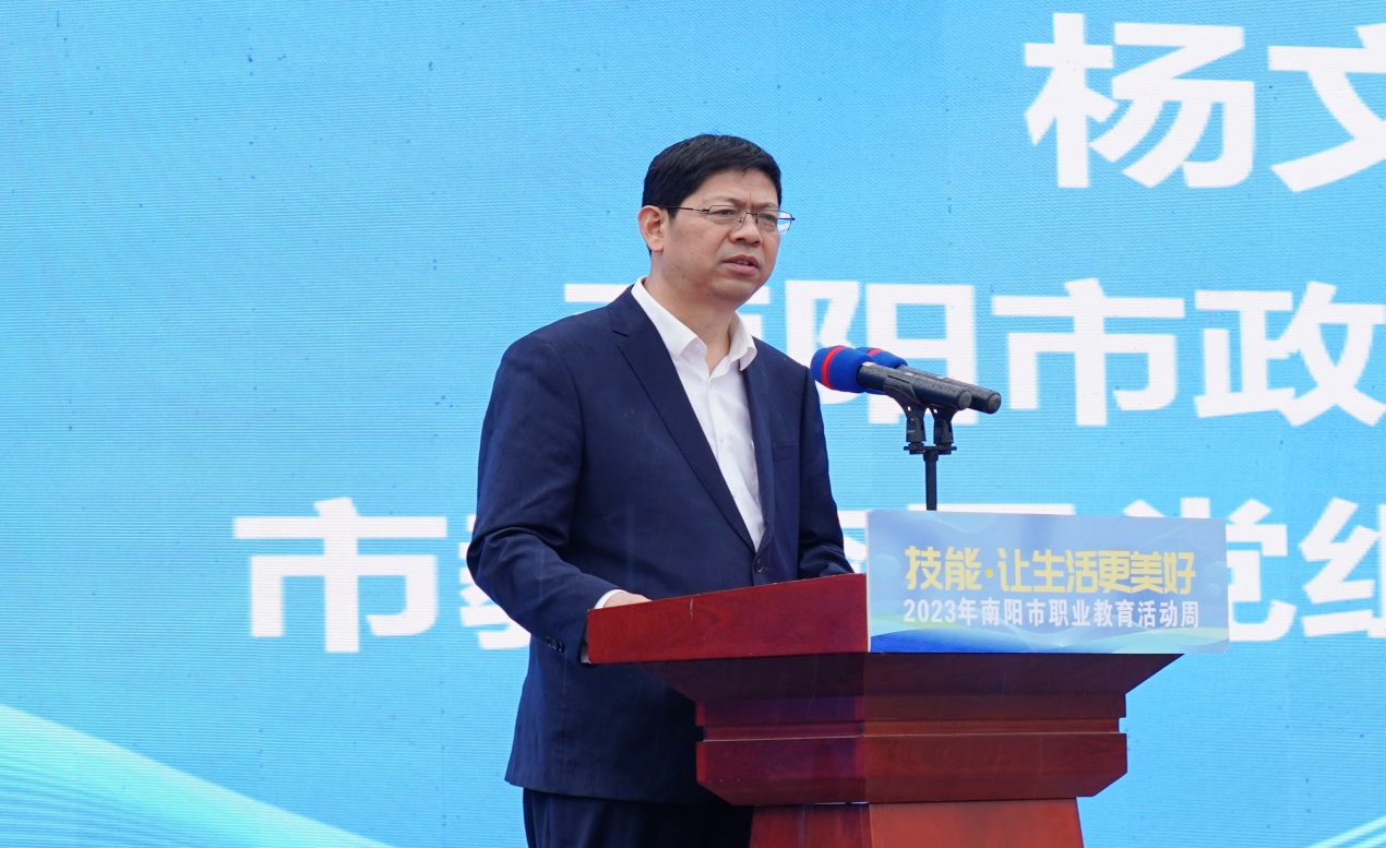 杨文普向这次活动的成功举办表示热烈的祝贺!向职业教育战线的同志们致以崇高的敬意!向支持职业教育改革发展的社会各界表示最衷心的感谢!他指出,近年来,市委市政府积极贯彻中央和省委关于职业教育的安排部署,密集出台系列支持政策,集中破解制约发展的堵点、难题,擘画全市职业教育改革发展的蓝图。他强调,各级、各部门要精心组织,积极开展内容丰富、形式多样的宣传活动,着力让职业教育活动周成为社会了解职业教育、体验职业教育、共享职业教育成果的窗口,推动职业教育“融入”经济、“汇入”生活、“嵌入”文化,进一步营造国家尊重技能、社会崇尚技能、人人享有技能的良好氛围;各级、各部门要以深化产教融合为重点、以职普融通为关键、以科教融汇为新方向,推进职业教育协同融合发展。他希望,更多的企业能够主动参与职业教育,共同助力南阳转型发展和产业升级,为高水平建设现代化省域副中心城市提供智力支持和人才支撑。
