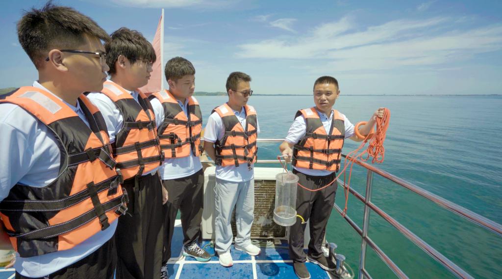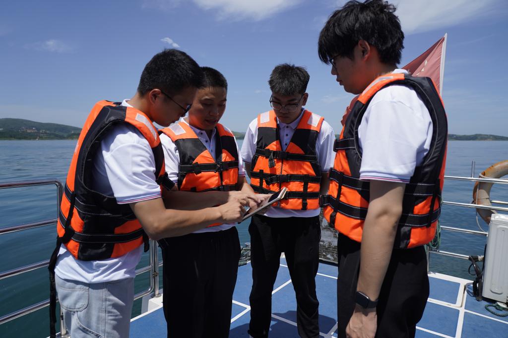 在丹江口水库,师生一起乘船感受库区风光,测绘环保工程学院张克老师带领学生现场进行水样采集和监测,并为大家讲解如何运用高分影像进行遥感测量,大家共同品尝了清澈甘甜的丹江水,感受了水源地的优质水源。