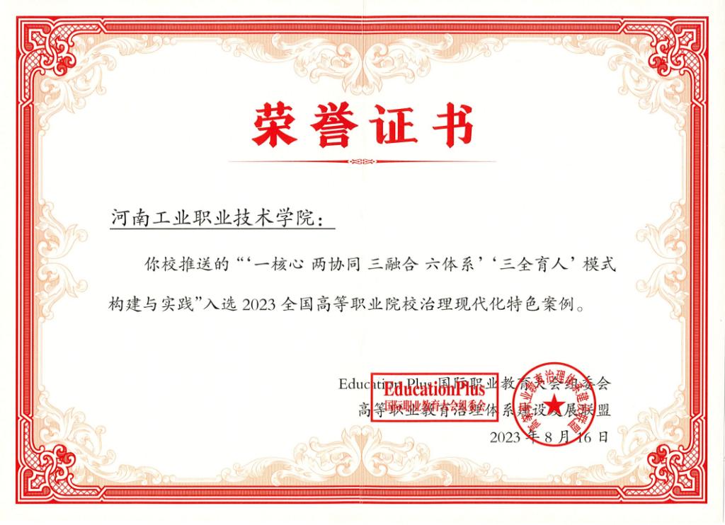 8月16日,2023 EducationPlus(第七届)中国(长沙)国际职业教育大会暨产教融合博览会——2023高等职业院校治理现代化交流研讨会暨高等职业教育治理体系建设发展联盟年会在长沙隆重举行。我校报送的《一核心 两协同 三融合 六体系“三全育人”模式构建与实践》获评“2023年全国高等职业院校治理现代化特色案例”。
