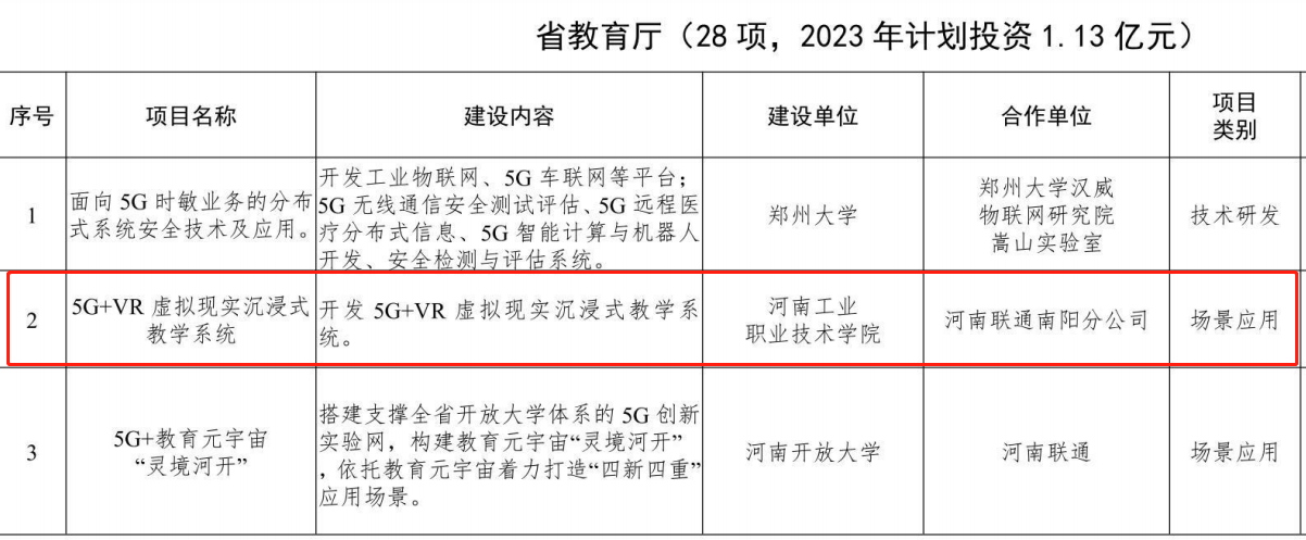 近日,河南省加快5G网络建设和产业发展工作领导小组办公室公布了《2023年度河南省5G重点项目清单》,河南工业职业技术学院主持申报的“5G+VR虚拟现实沉浸式教学项目”成功入选。