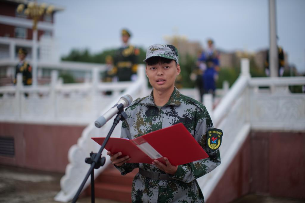 接着,自动化工程学院新生代表机电设备技术2301班学生林家豪在国旗下发言。他追忆了自身求学经历,分享了自己面对学校学院新环境、新挑战的所思所想,对即将开启的学习生活满怀期待,并表示在未来的学习与生活中,自己将同学们一道,做不负青春和韶华的奋斗者,做不负祖国和时代的追梦人。